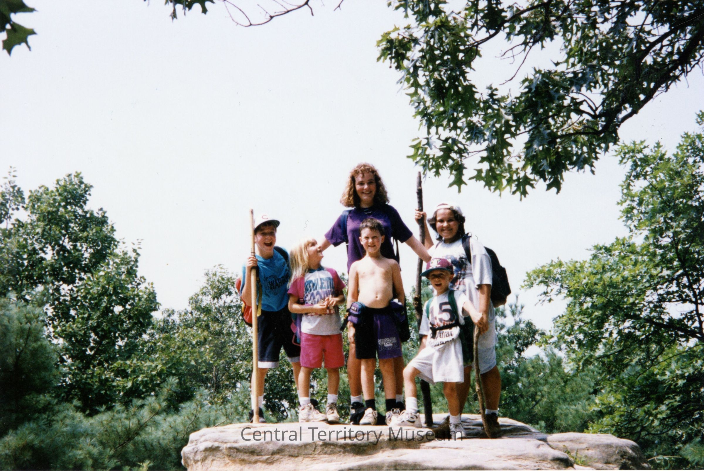 Color photo taken during a day camp hosted by the St. Charles (Tri-City), IL Corps. A group of boys and girls pose for the camera. They are standing on a large rock or rock formation and trees fill the background. Several of the children are wearing backpacks and holding long hiking poles. A handwritten note on the back identifies the place as Starved Rock State Park.