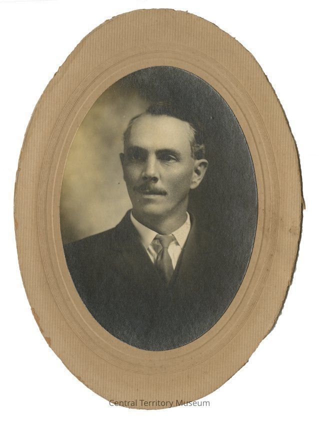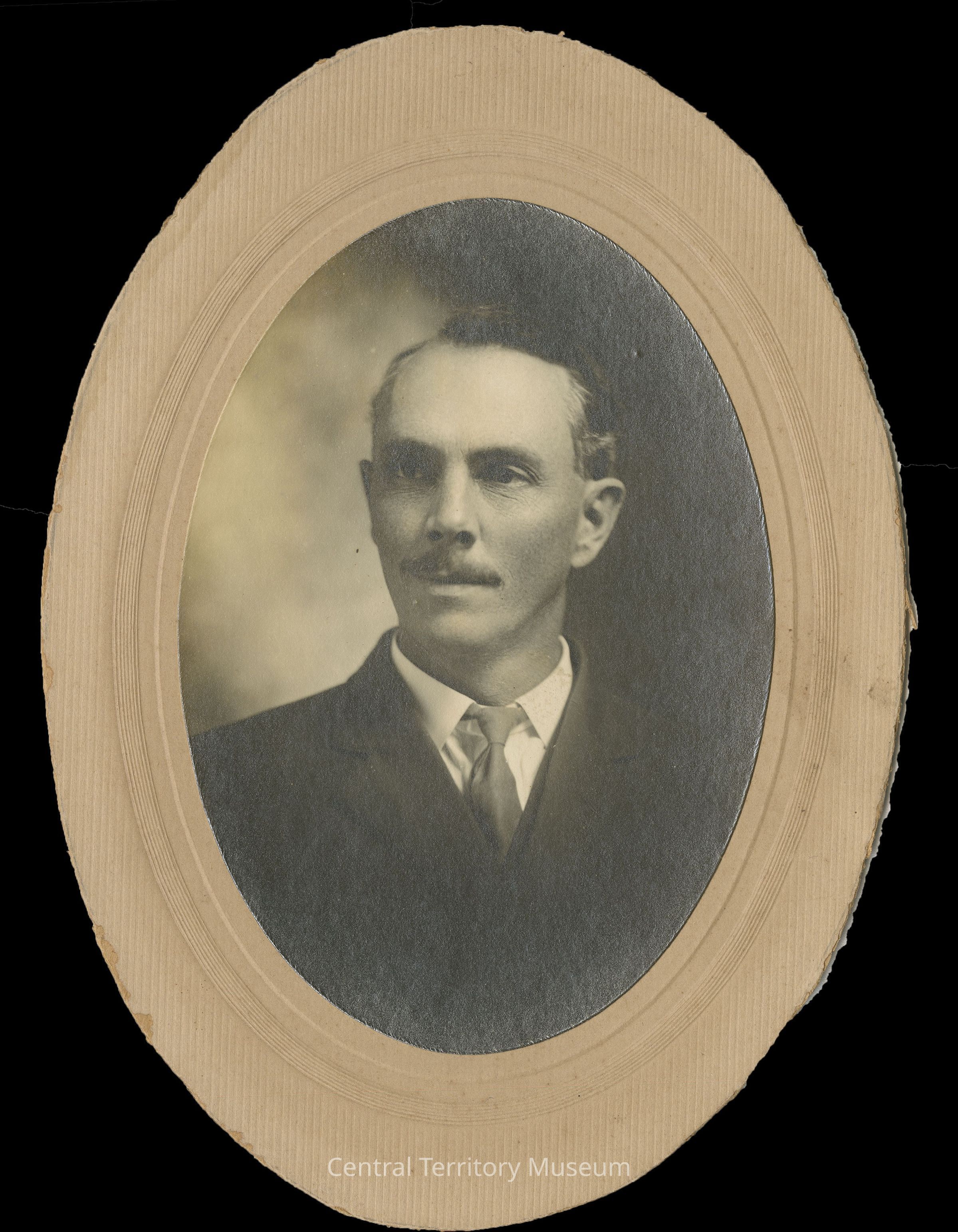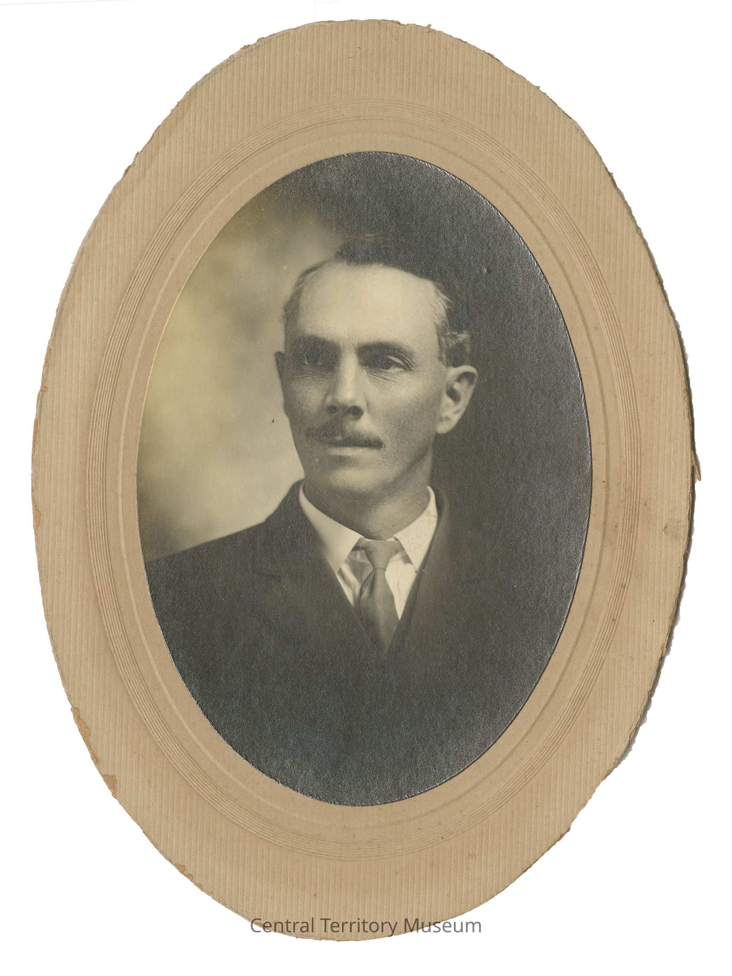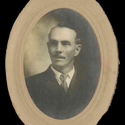 Black and white photograph of Floyd O. Burdick. Oval framed cabinet card. Photograph from chest up. Floyd wears a dark suit with a lighter tie and white shirt. He has a mustache and stares forward and to the left. Slight smile.
