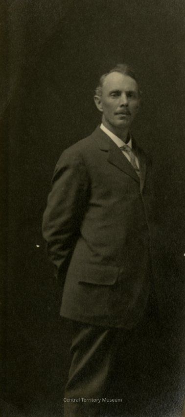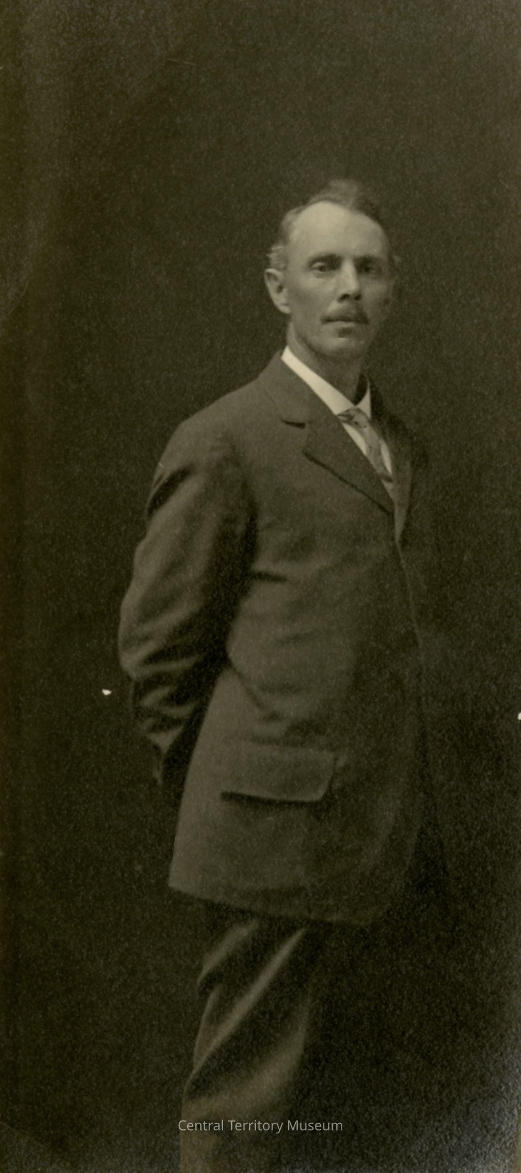 Black and white photograph of Floyd O. Burdick. Floyd has a mustache and wears a suit. He is standing against a dark background, with his hands clasped behind his back. Written on back in red pencil: "Floyd Burdick"