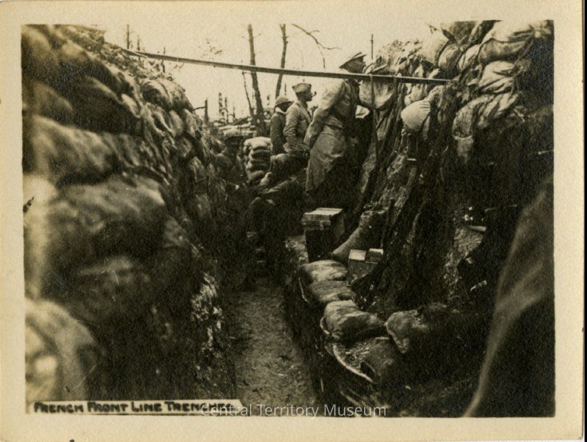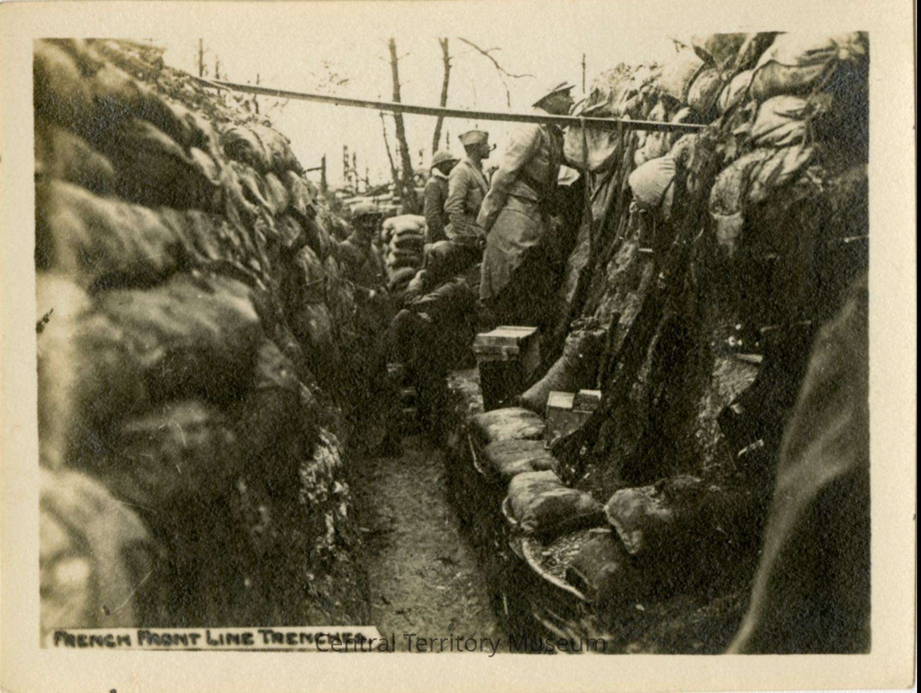 Black and white photograph with the printed caption, "FRENCH FRONT LINE TRENCHES." The photograph shows the view from inside a trench. The trench walls are lined with sandbags. In addition to equipment, there are five men in the trench. One man sits on a sandbag ledge facing another man who is standing. Three men stand on the sandbag ledge and look out over the trench walls. They are all in military dress and one man has a pipe in his mouth.Acquisition