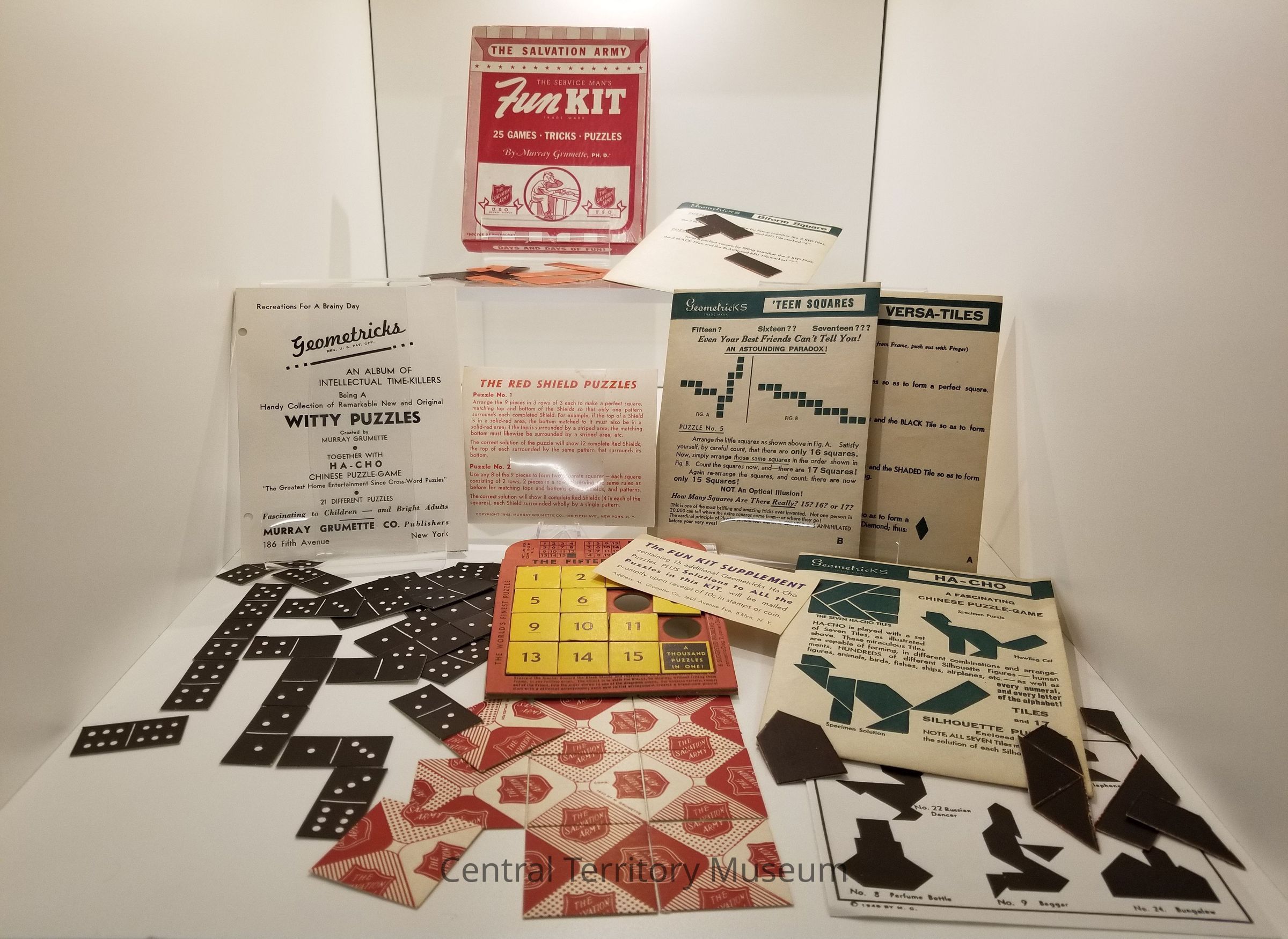 The Salvation Army did its part to improve the lives of WWII servicemen. Partnering with the USO and other aid groups, they distributed kits like this to service men which contained games to play during their off hours. The games included cardboard dominoes, puzzles, and shape games. A kit with an additional 15 puzzles could be purchased for 10 cents (in cash or stamps) by mail.Acquisition