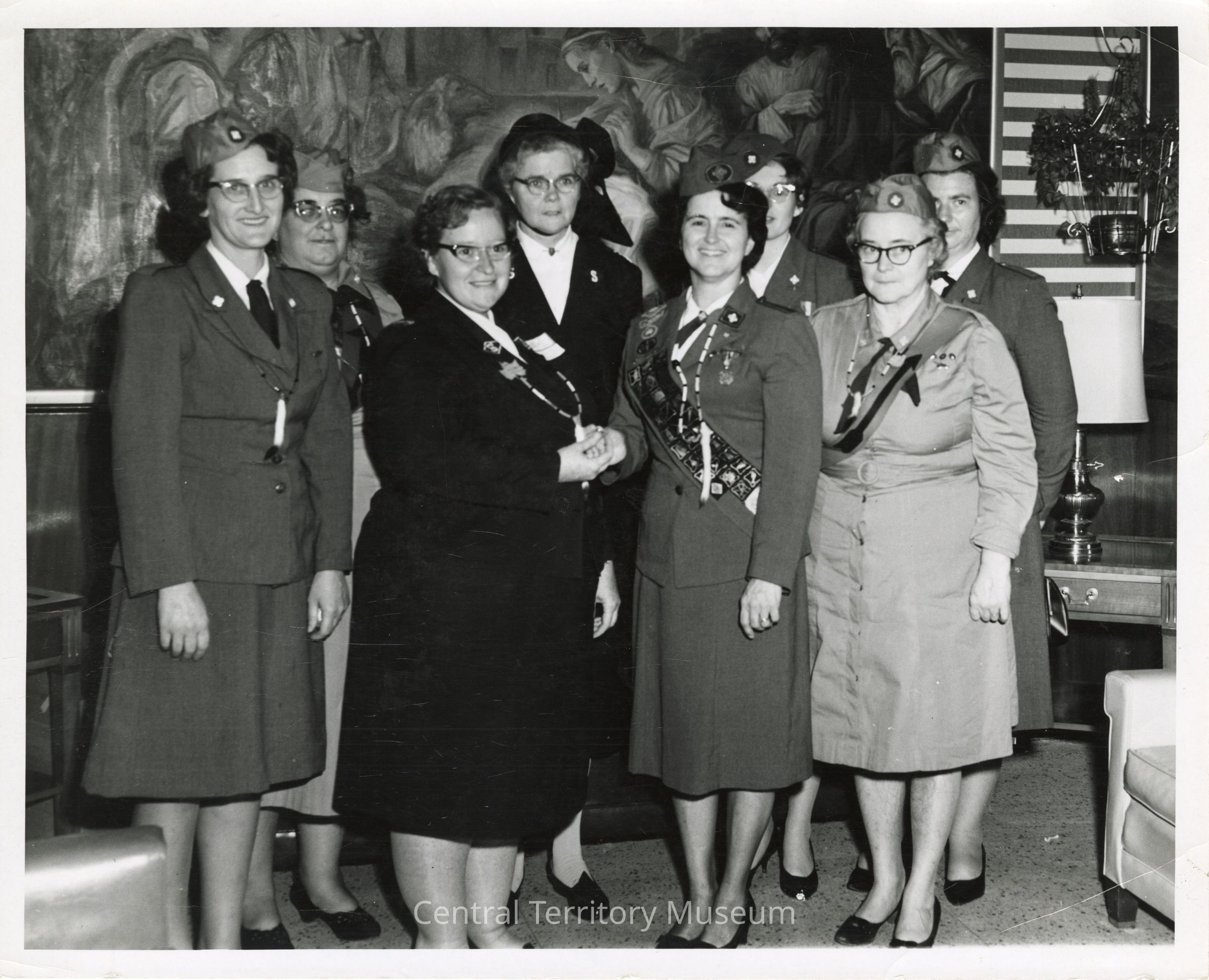 Photo of eight women, wearing either Salvation Army uniforms or Girl Guard uniforms with Black Arrow necklaces. The two women in the center are shaking hands with the woman on the right, in a Girl Guard uniform with a sash holding multiple merit badges. A large mural, portraying religous art, can be seen in the background.Acquisition