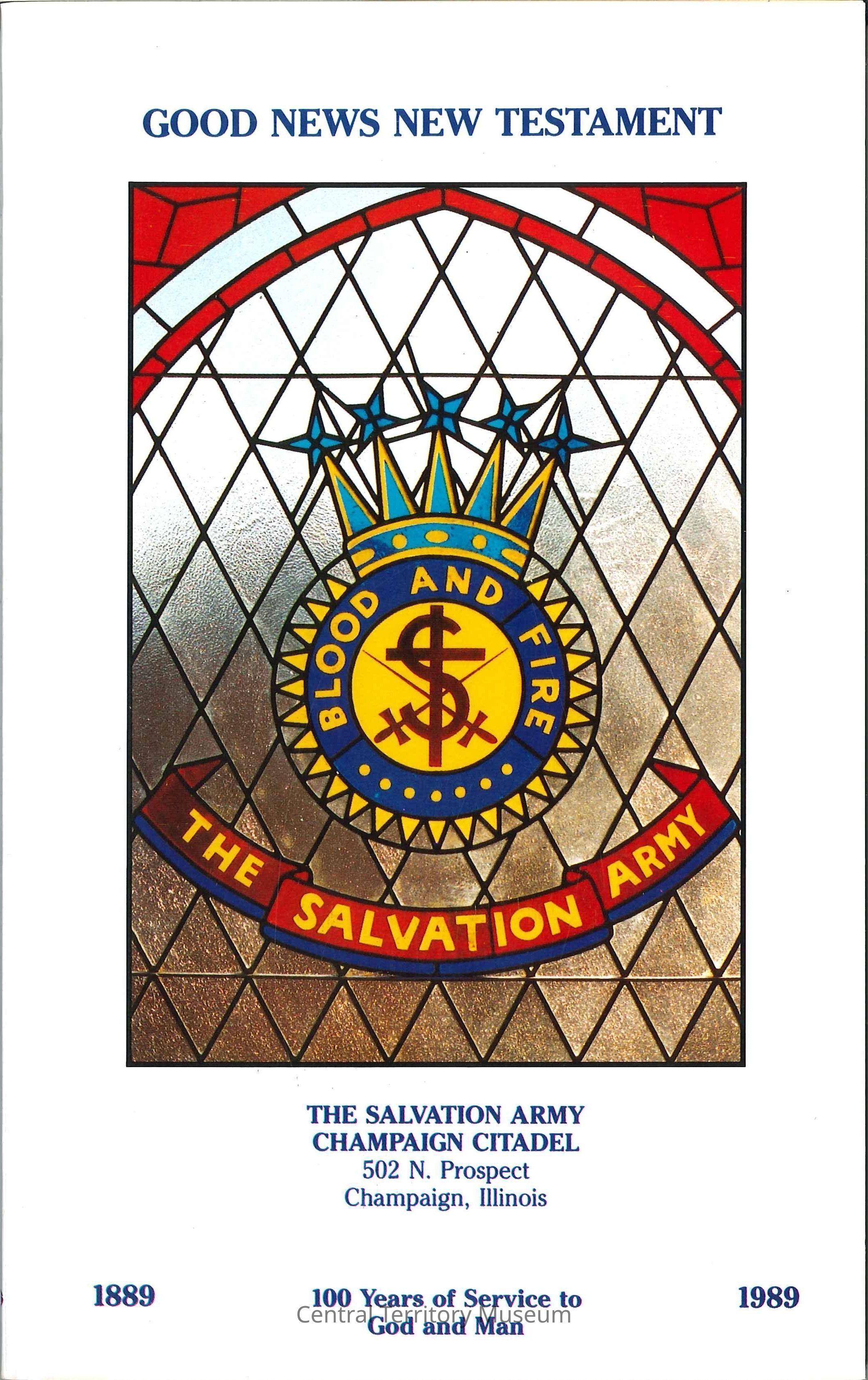 Paperback book containing the New Testament with cover art produced for the centennial celebration of the Champaign, IL Corps. The front cover has a color illustration depicting The Salvation Army crest as if it was a stained glass piece inset in a larger window. The title is printed above the illustration and the information about Champaign is printed below.