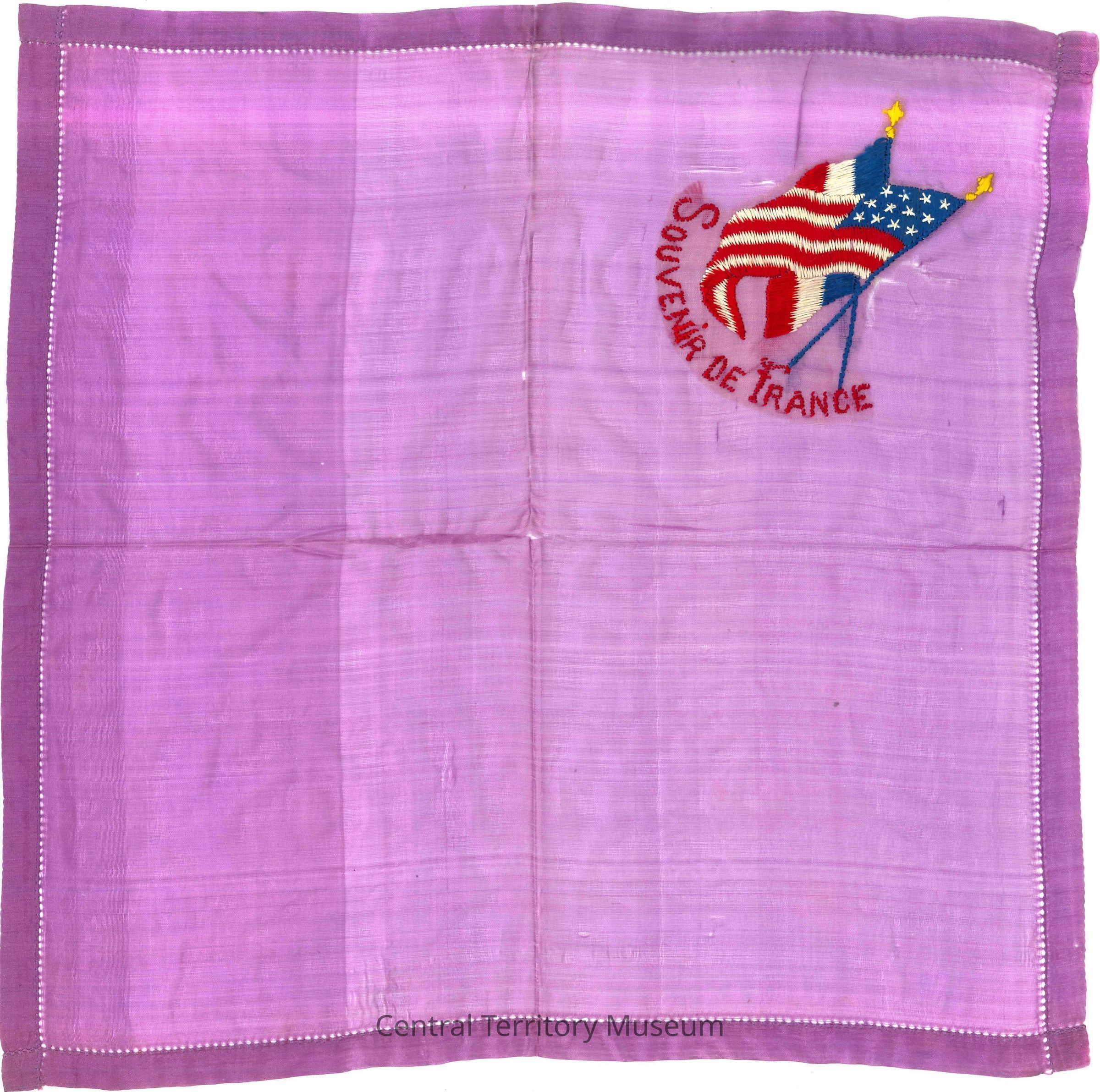 China silk handkerchief. Square, light purple colored silk. Embroidered with a French and United States flag motif, with text "Souvenir de France" in red, in the upper righthand corner.