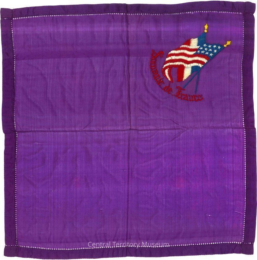 China silk handkerchief. Square, dark purple colored silk. Embroidered with a French and United States flag motif, with text "Souvenir de France" in red, in the upper righthand corner.