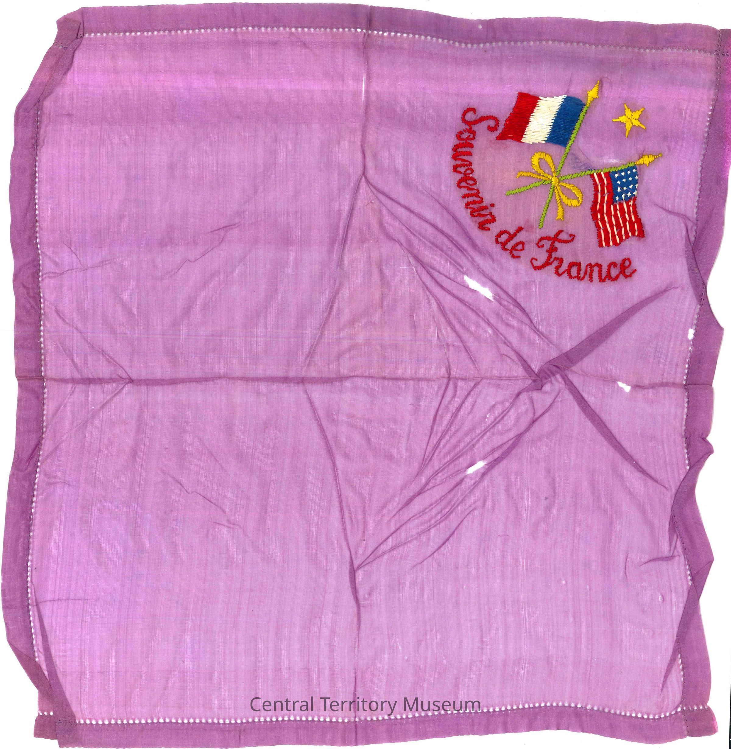 China silk handkerchief. Square, light purple colored silk. Embroidered with a French and United States flag motif, with text "Souvenir de France" in red, in the upper righthand corner. The two flags cross, tied together in a bow with a yellow ribbon, and there is one yellow star centered above the flag motif.