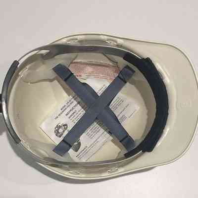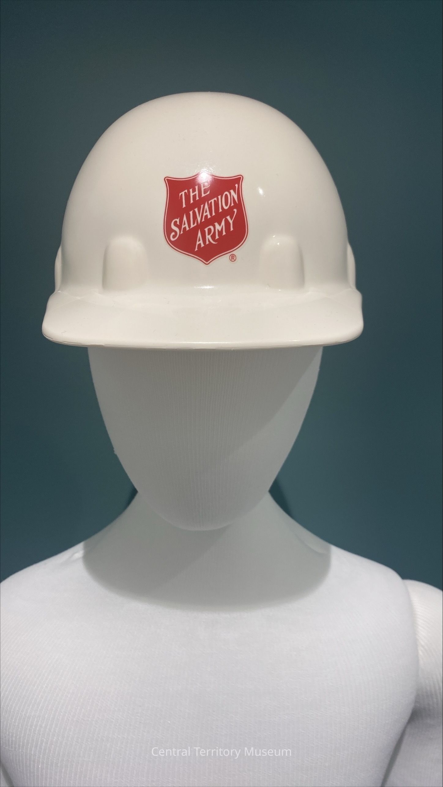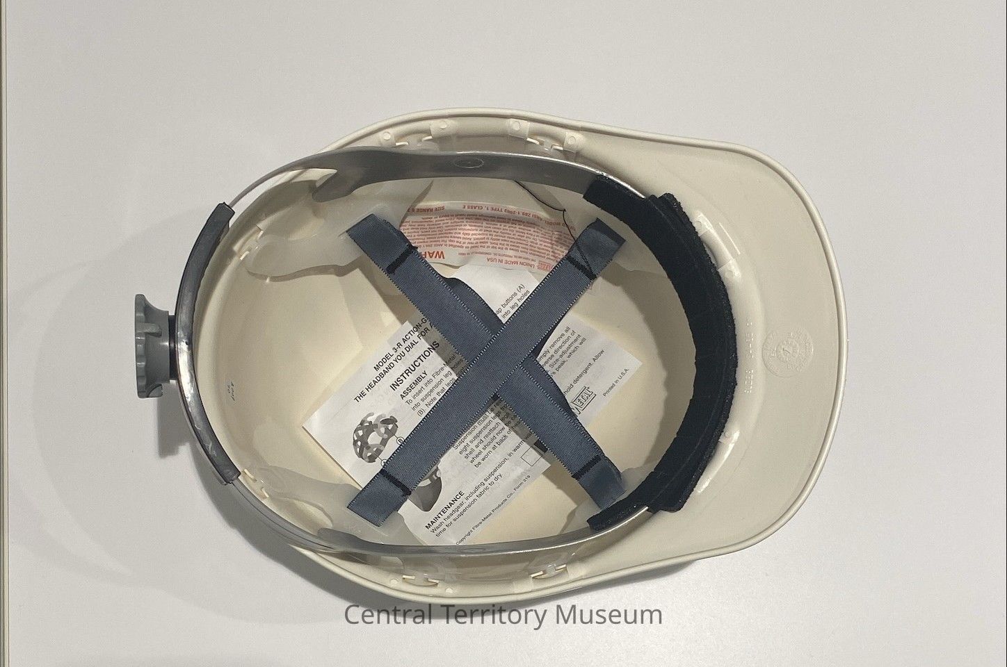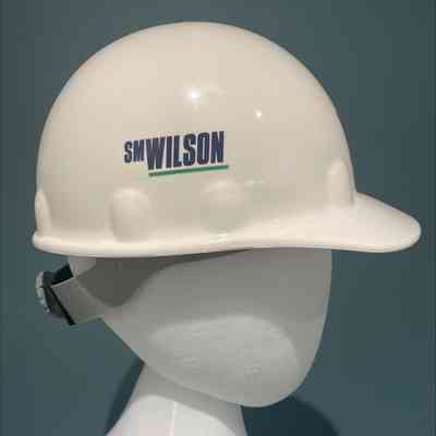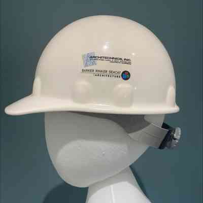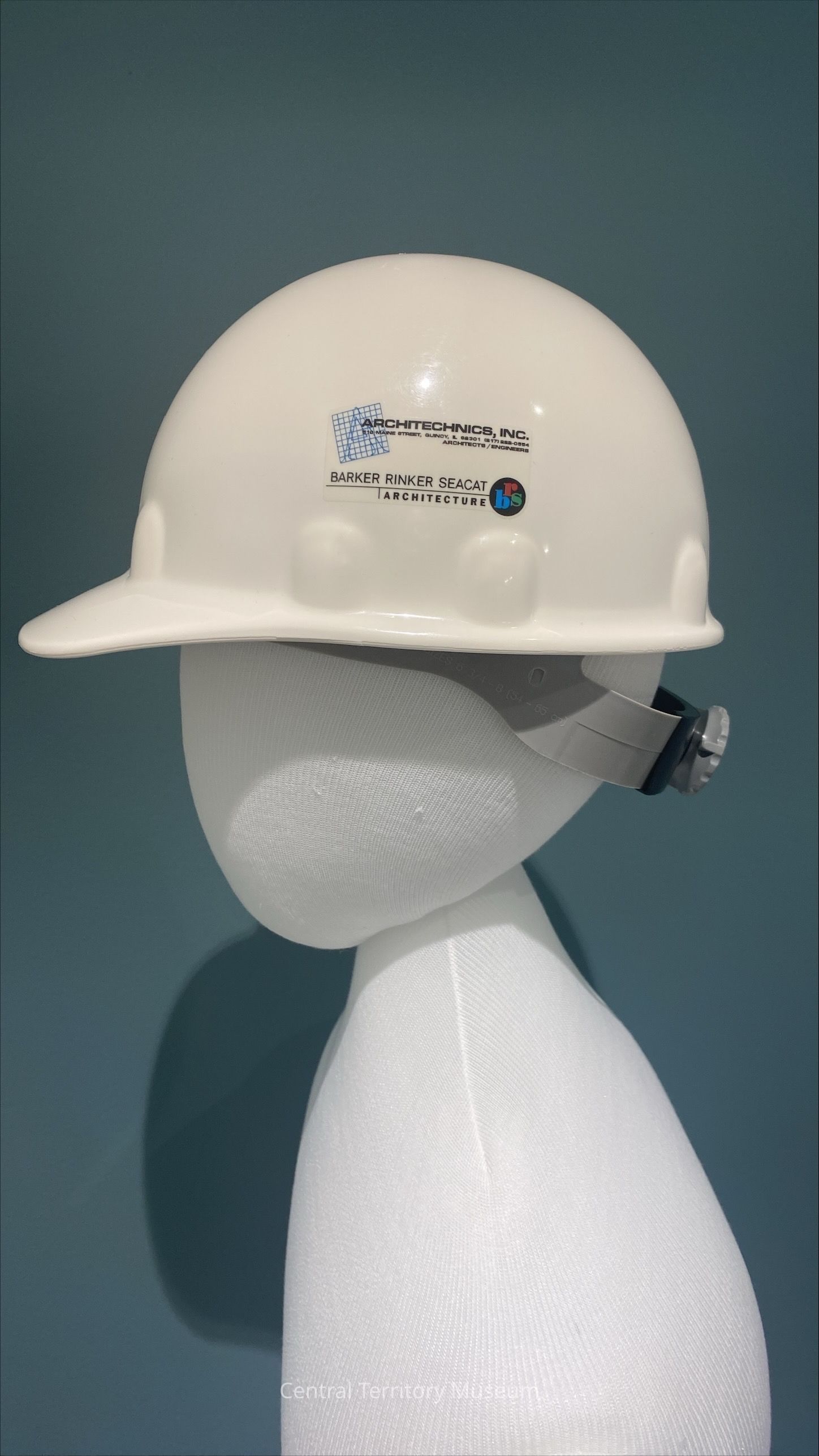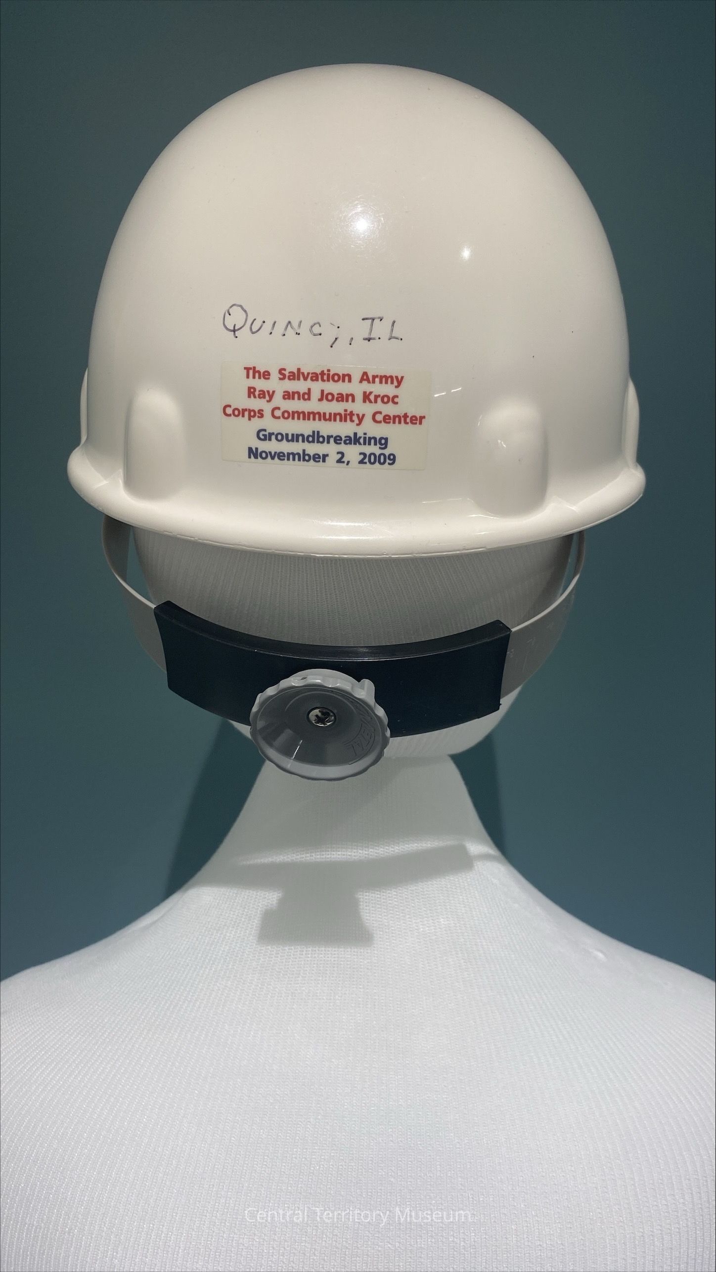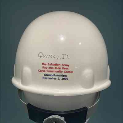 Hard Hat. White, with The Salvation Army Red Shield logo on the front, logos for Architechnics, Inc., Barker Rinker Seacat Architecture, and SM Wilson on the left and right sides, and a label for the event on the back. The location, Quincy, IL, is handwritten on the back above the label. The interior of the safety helmet has a an adjustor in the back, a suspension system, and instructions for use.Acquisition