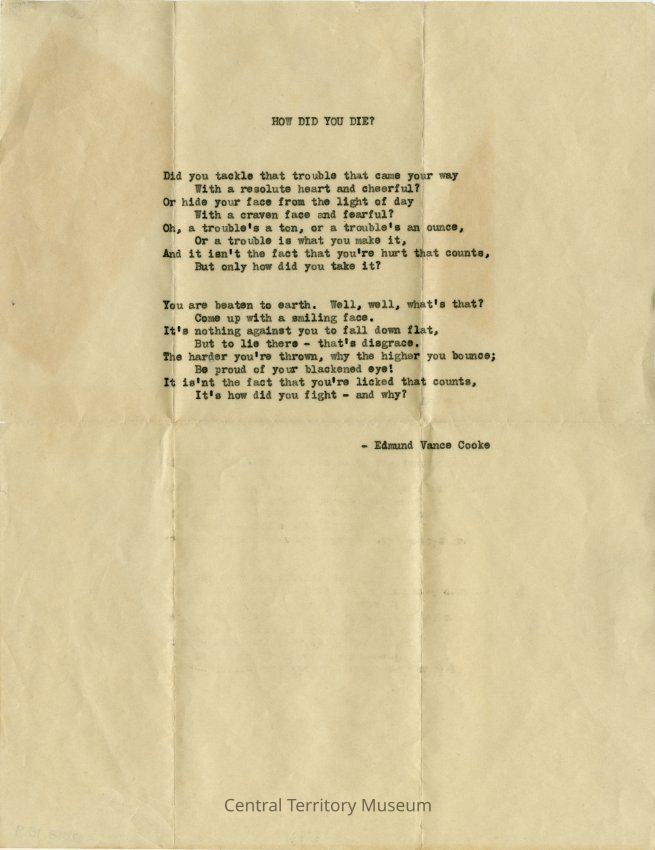 Poem "How Did You Die?" by Edmund Vance Cooke, typed in black ink on white/cream paper. The title ("HOW DID YOU DIE?") is centered above the poem and the author's name ("-- EDMUND VANCE COOKE" is below and aligned to the right.