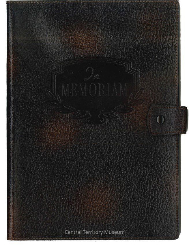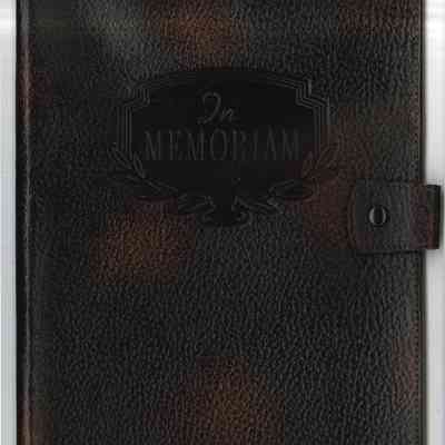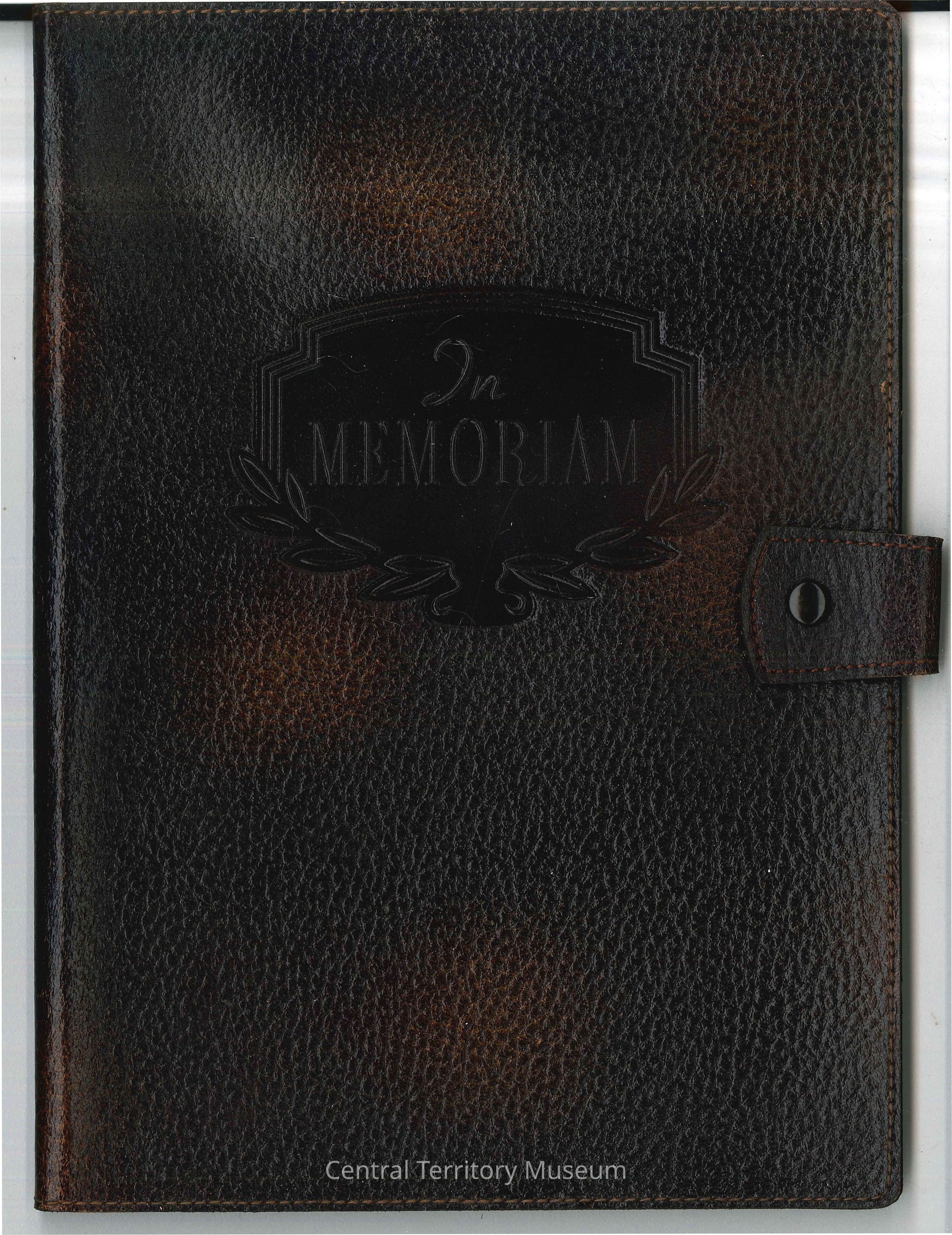 Brown leather cover with snap closure. Raised title "IN/ MEMORIAM" inside raised decorative frame on front cover.