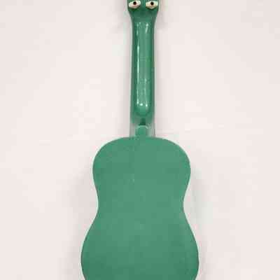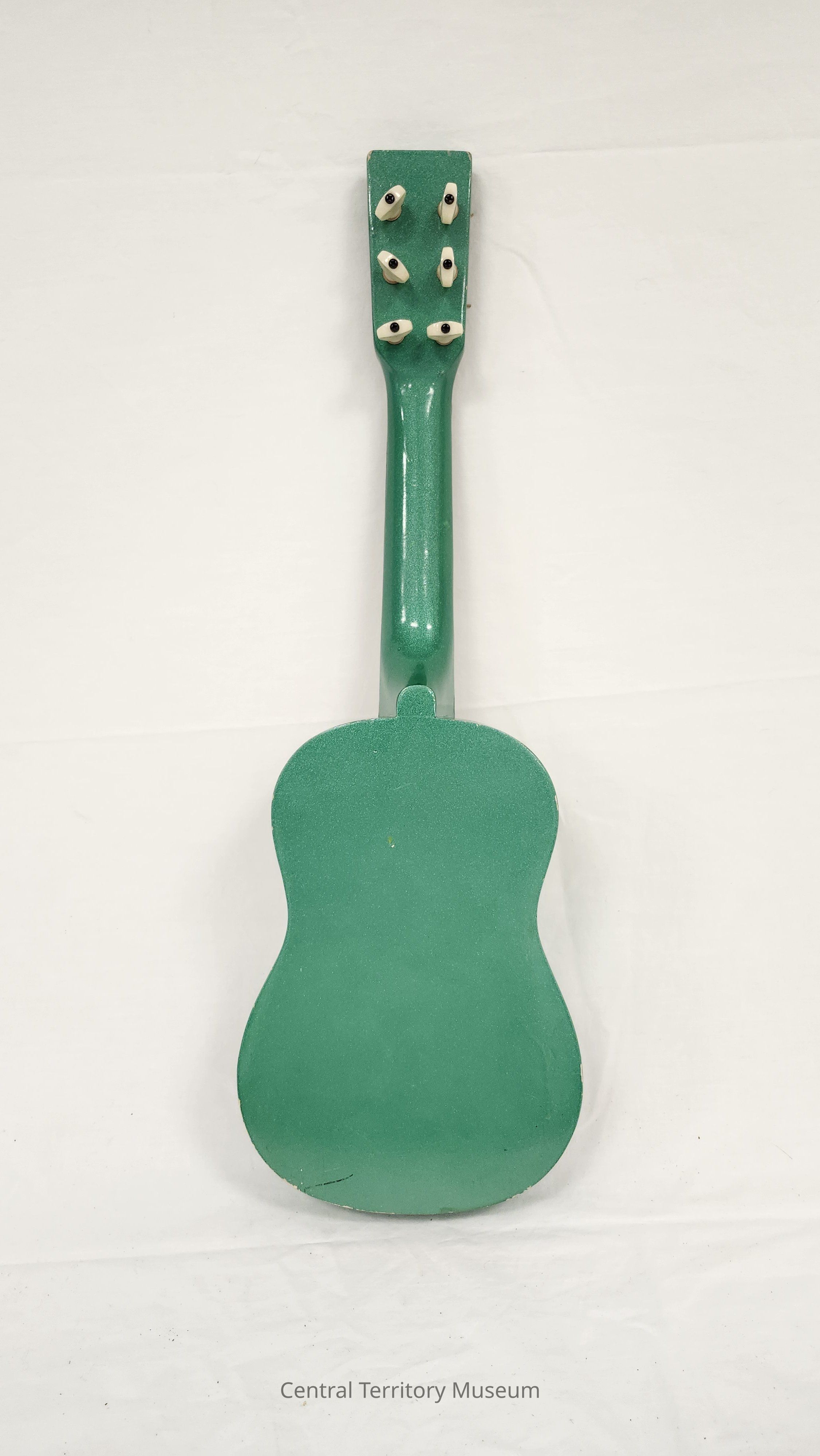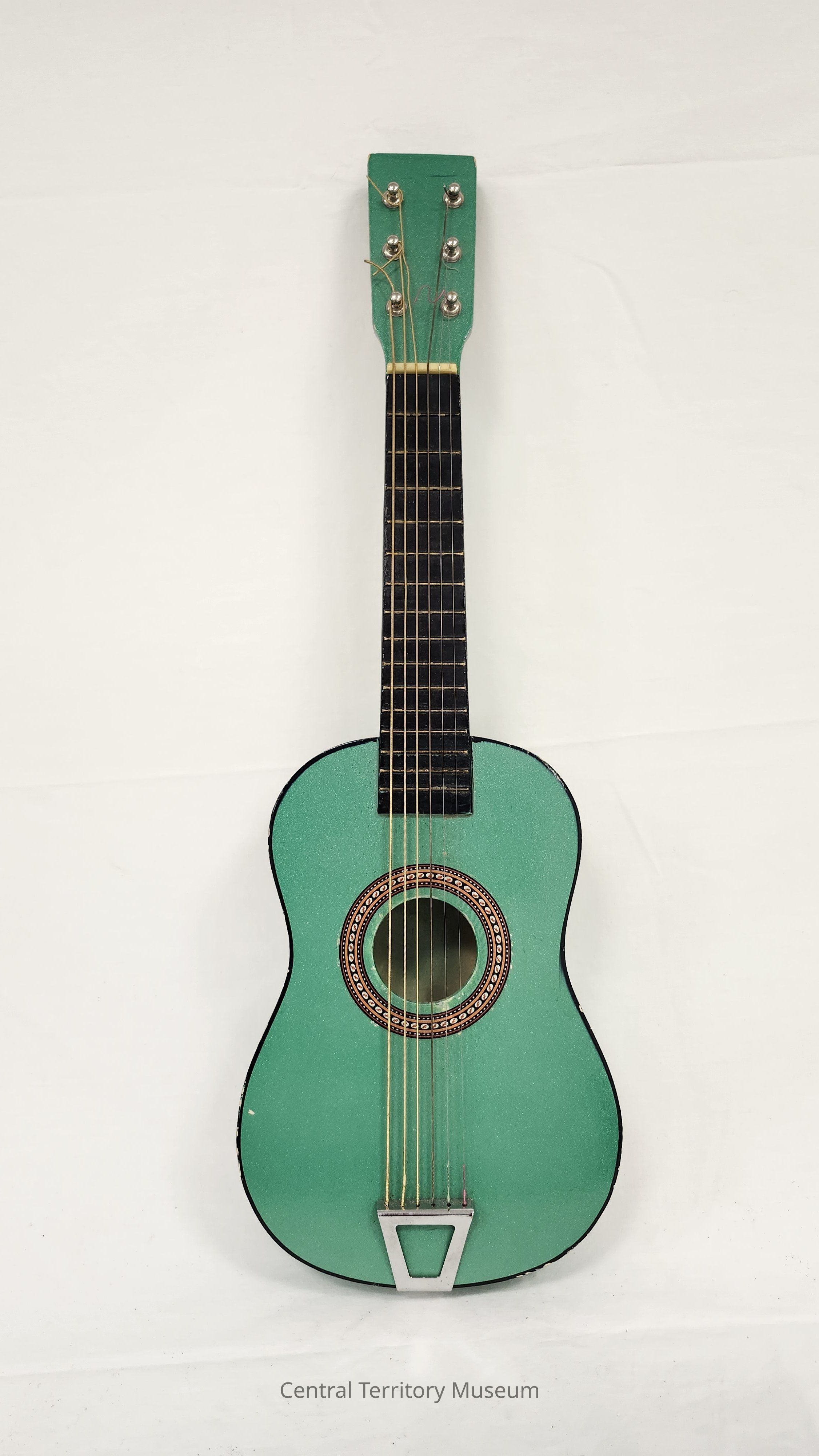 Acoustic guitar. The small body size indicates this instrument was intended as a travel guitar or as a junior size instrument. The body is wood with black trim around and finished with a sparkly green color. A circular decoration is affixed around the sound hole using black, white, and orange colors. The strings are anchored at the tail using a silver metal piece and extend up the neck to posts on the head. There is no bridge on the guitar. The tuning pegs are on the back side of the guitar head.