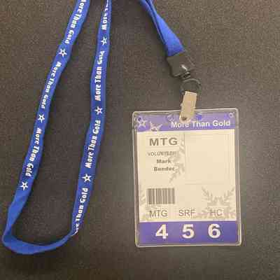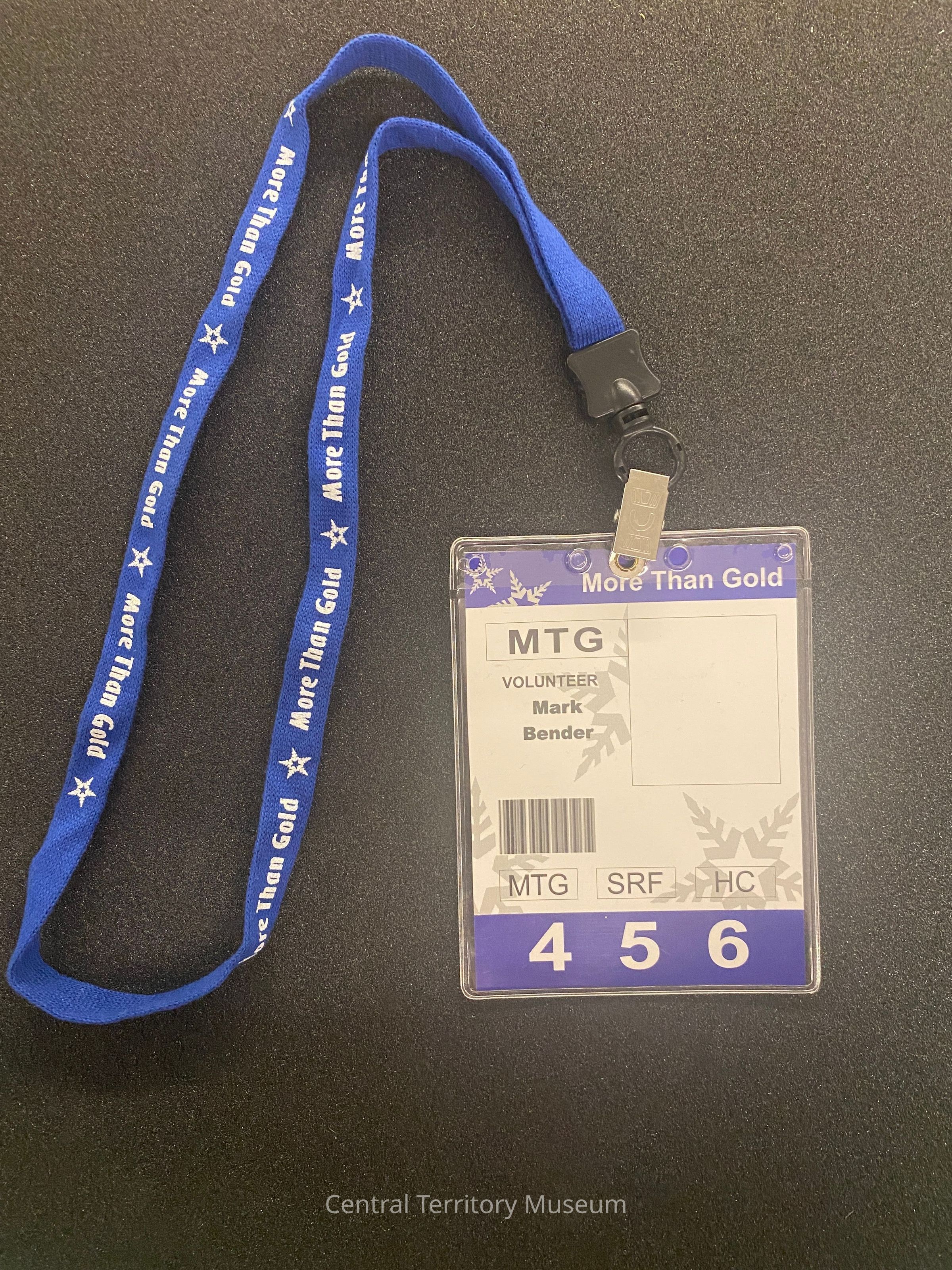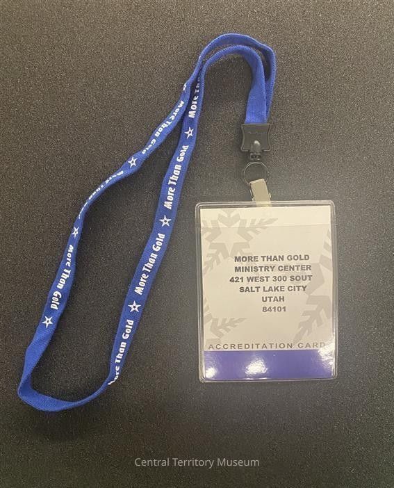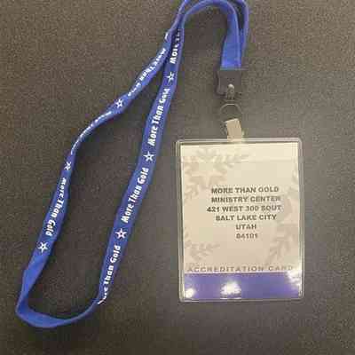 Blue fabric lanyard with metal clip holding a clear plastic tag. The lanyard is dark blue with the motto More Than Gold flanked by stars on either printed on the outer sides. The double sided paper insert in the tag is white with dark blue edges and gray snowflakes. The motto More Than Gold is printed in the upper right corner and has Volunteer Mark Bender printed on the left center. The back of the paper insert has the address for the More Than Gold Ministry Center in Salt Lake City, Utah.