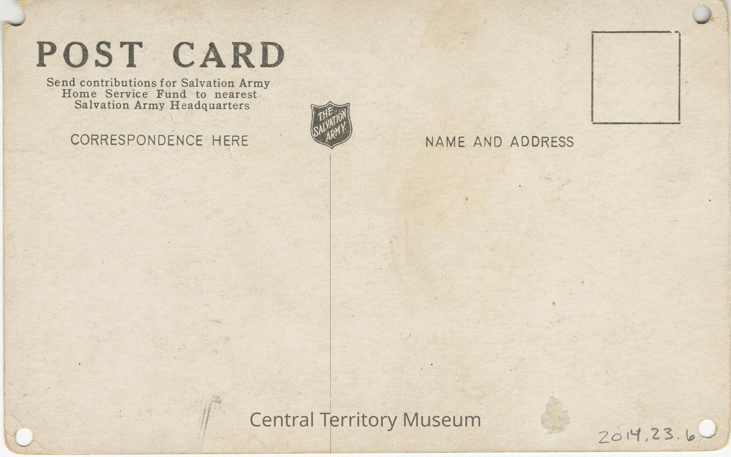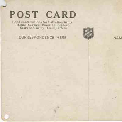 The back of the postcard has a thin line delineating the correspondence and address sections. The line is topped with a Salvation Army Red Shield logo. In the upper left, "Post Card" is printed in a bold font with "Send contributions for Salvation Army Home Service Fund to nearest Salvation Army Headquarters" under.Acquisition