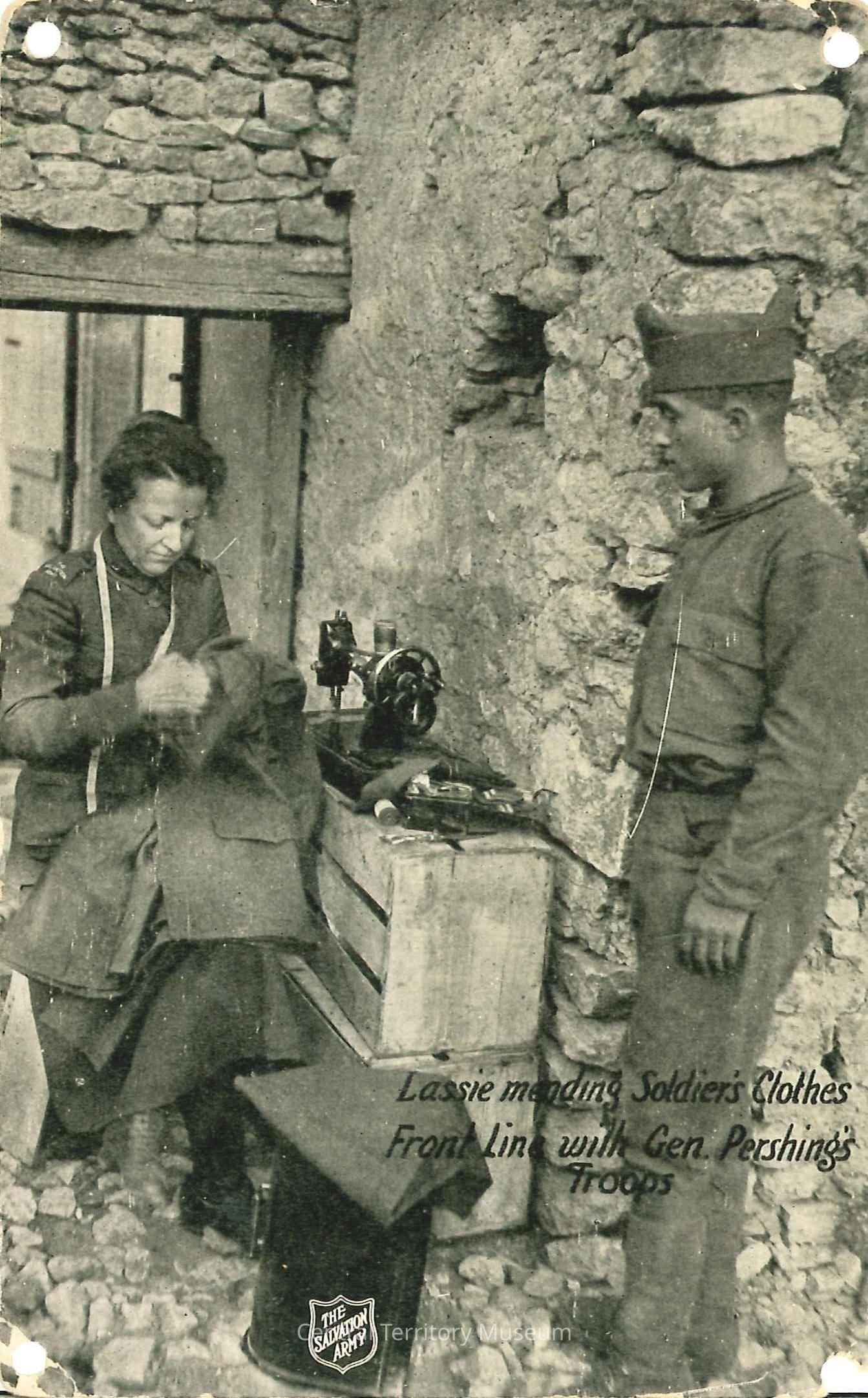 Photo postcard. The black and white image depicts Envoy Eva Alice Springer, a Salvation Army War Service Worker, seated next to two crates which hold a hand crank sewing machine and sewing supplies. She wears a World War I Salvation Army War Service uniform and a tape measure is draped around her neck. She holds a United States Army tunic. Near her feet is the dark dome shaped lid to the sewing machine placed on its side. A Salvation Army Red Shield logo has been superimposed on top of the dark lid. Additional fabric rests on the lid. To her right a United States Army soldier stands wearing an overseas fabric cap, blouse, pants, puttees, and boots. The two are located outside of a damaged building. The caption, "Lassie mending Soldier's Clothes Front Line with Gen. Pershing's Troops", is printed in black near the lower right corner. A Salvation Army Red Shield logo is printed along the lower edge. The caption, "Lassie mending Soldier's Clothes Front Line with Gen. Pershing's Troops", is printed in black near the lower right corner. A Salvation Army Red Shield logo is printed along the lower edge.