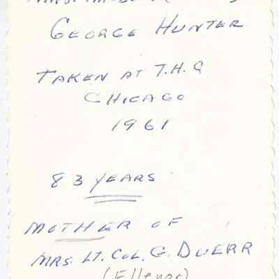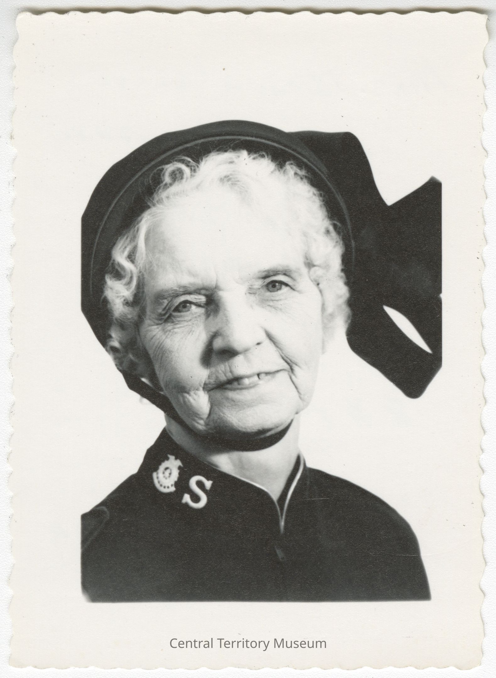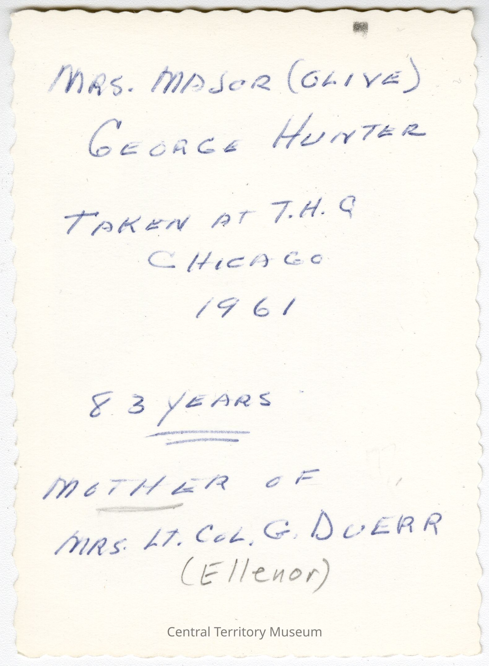 Black and white photograph of a headshot of Major Olive (Parker / Andrus) Hunter wearing her Salvation Army uniform and bonnet. A handwritten note on back reads "Mrs. Major (Olive) George Hunter taken at T.H.Q. Chicago 1961 83 years mother of Mrs. Lt. Col. G. Duerr (Ellenor).