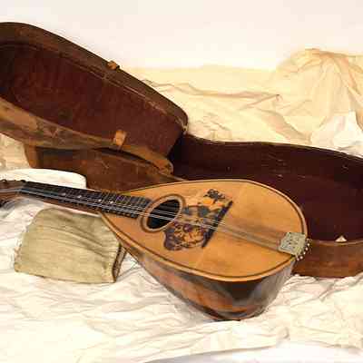 Mandolin. The top of the mandolin body is a light colored wood with a design below the sound hole. The back of the body is comprised of two different colors of wood, giving it a light and dark striped pattern. The tailpiece is stamped metal, anchoring the strings.
