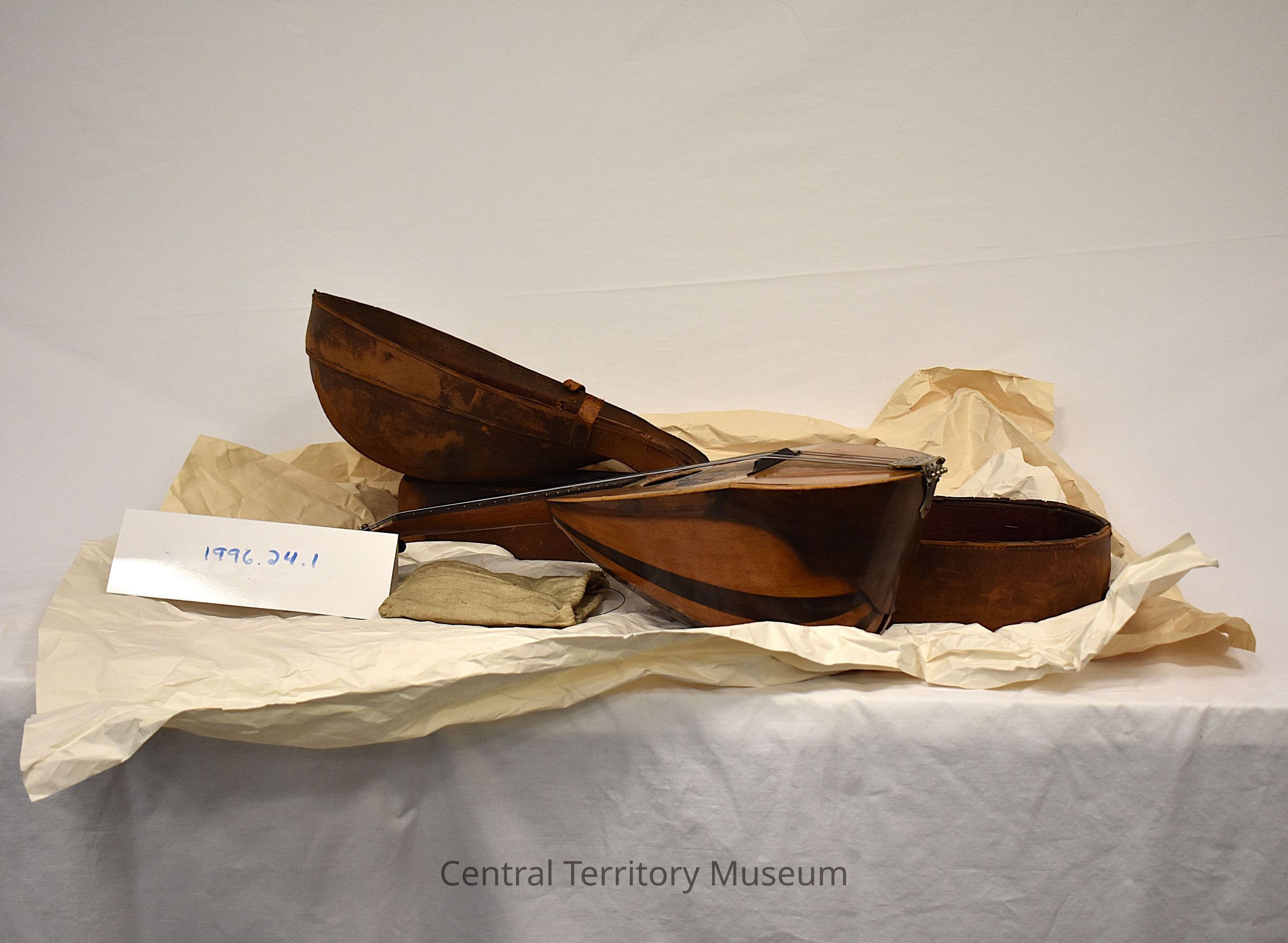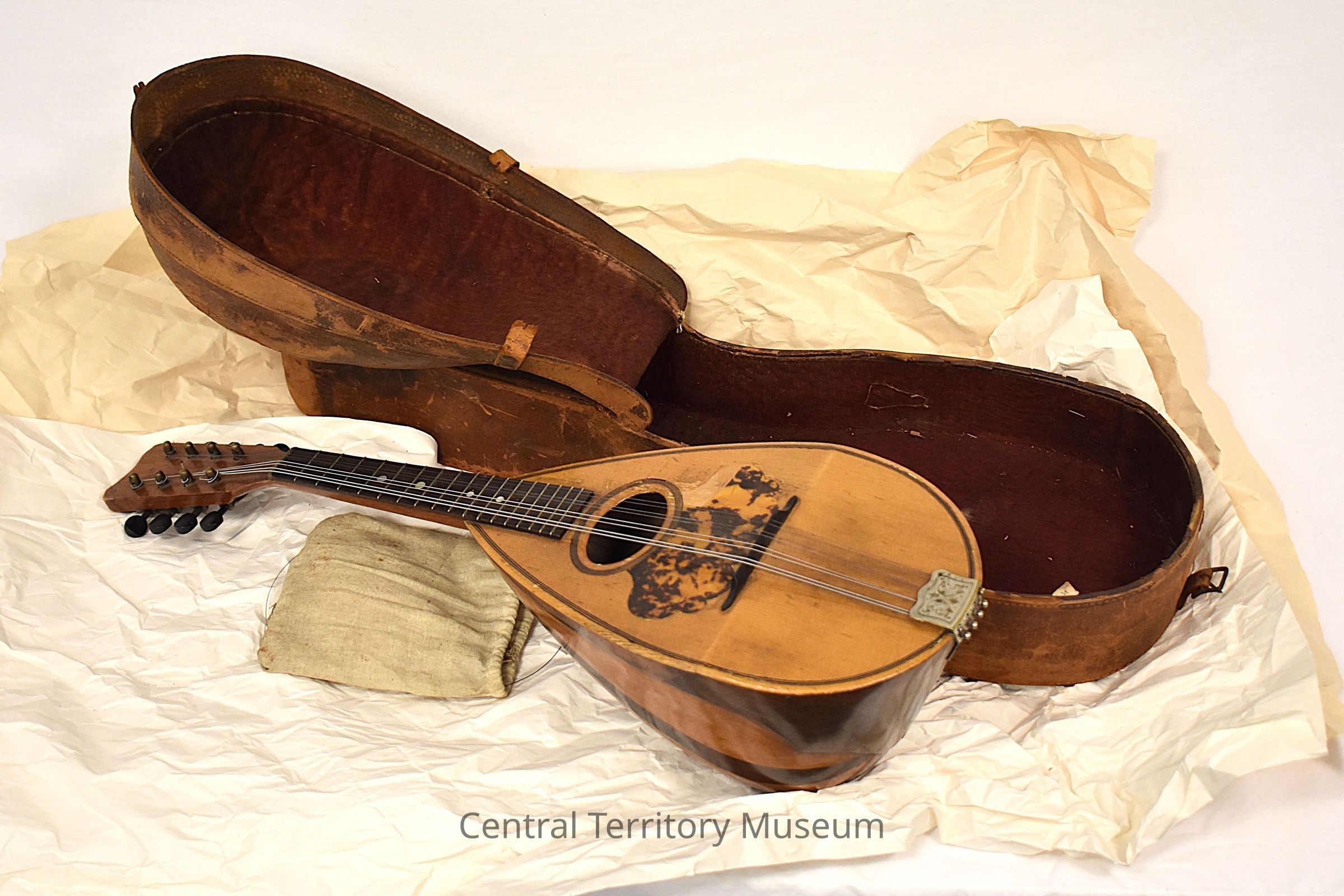 It is accompanied by a case with a cloth bag holding additional strings.