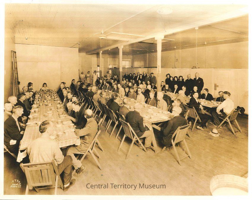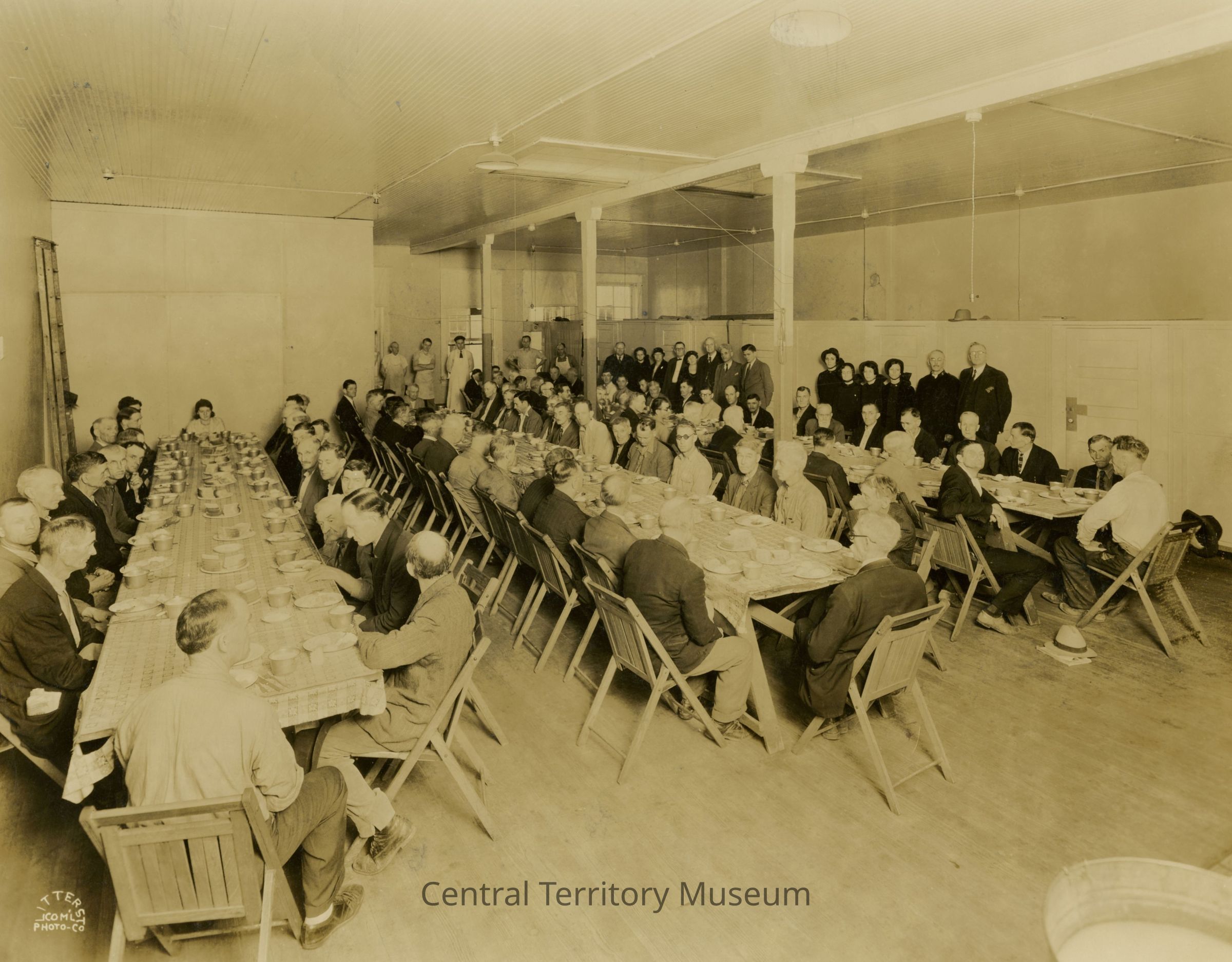 Black and white photograph of men sitting at three, long rectangular tables for a meal. Tables have checkered tablecloths. Dishes set at each place. Wooden chairs. The setup is inside (at a corps?). Ladder leans against the left wall. Standing along the right edge are TSA officers in uniform. Printed in the bottom lefthand corner in white "LITTERS/ COM'L/ PHOTO-CO" Men at tables taken by Litters Commercial Photo Co.