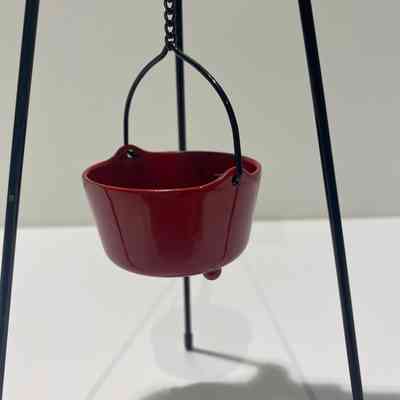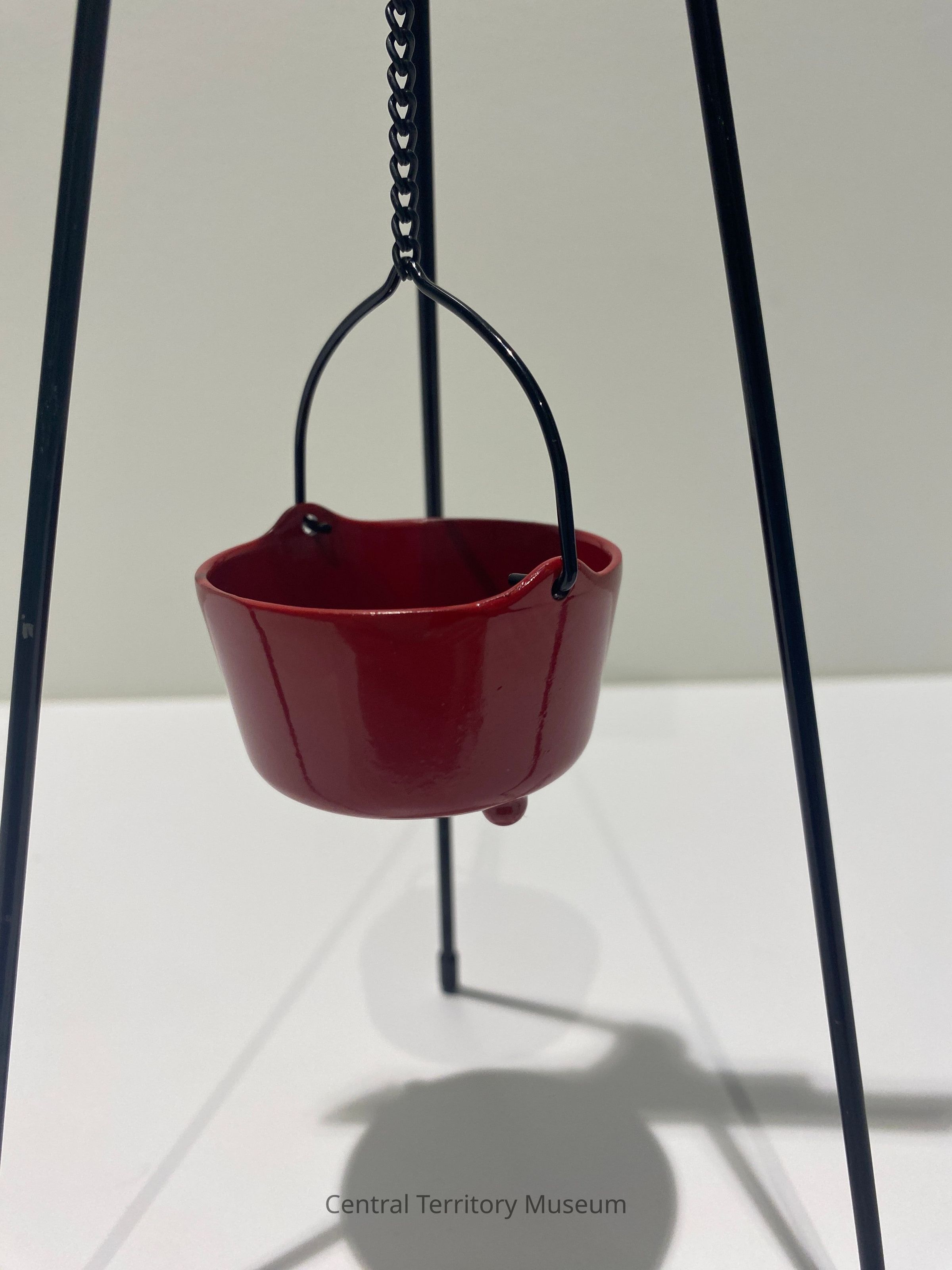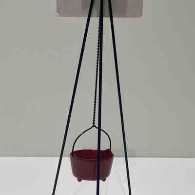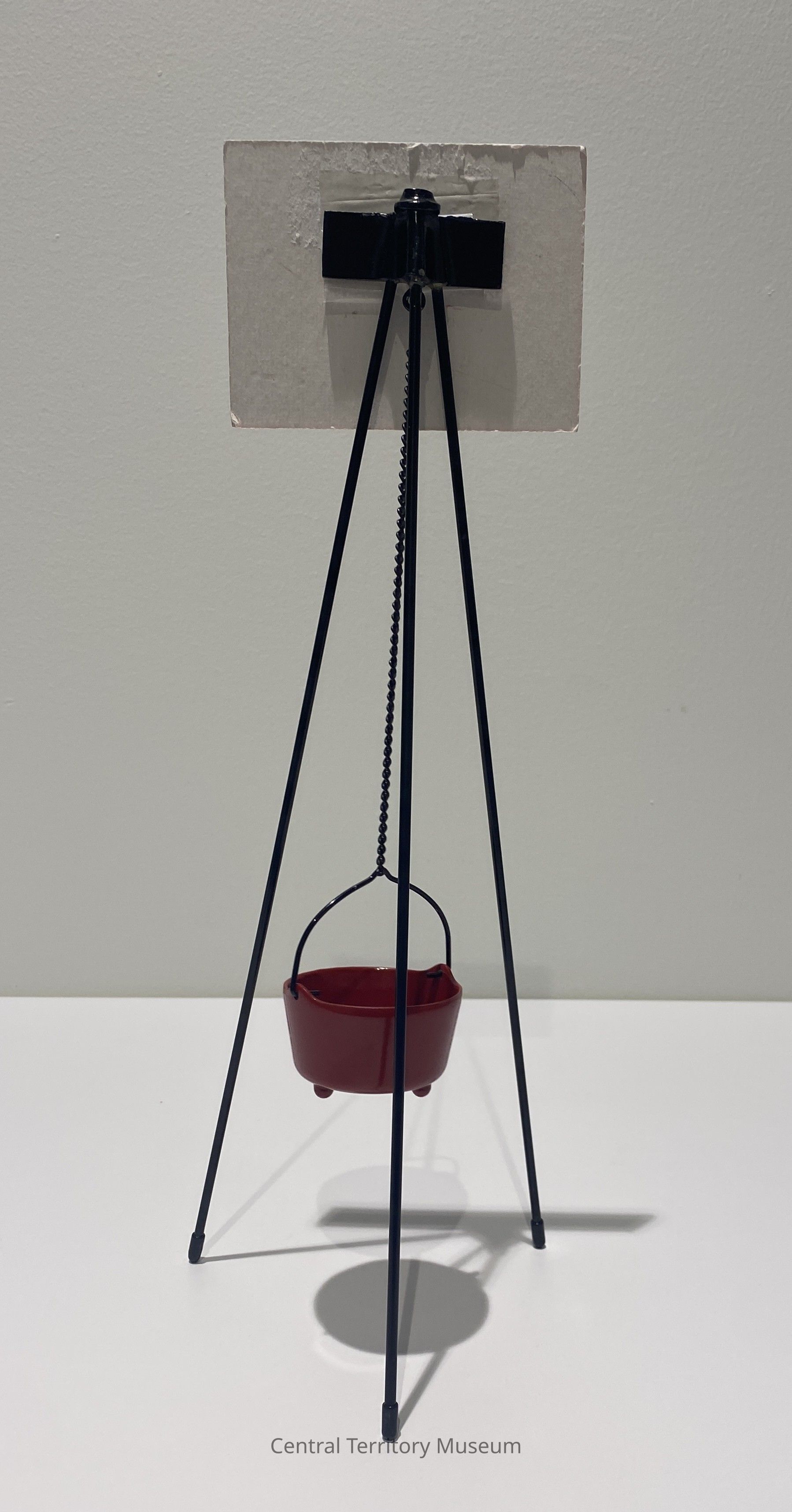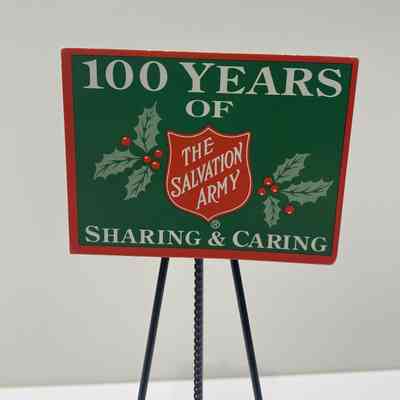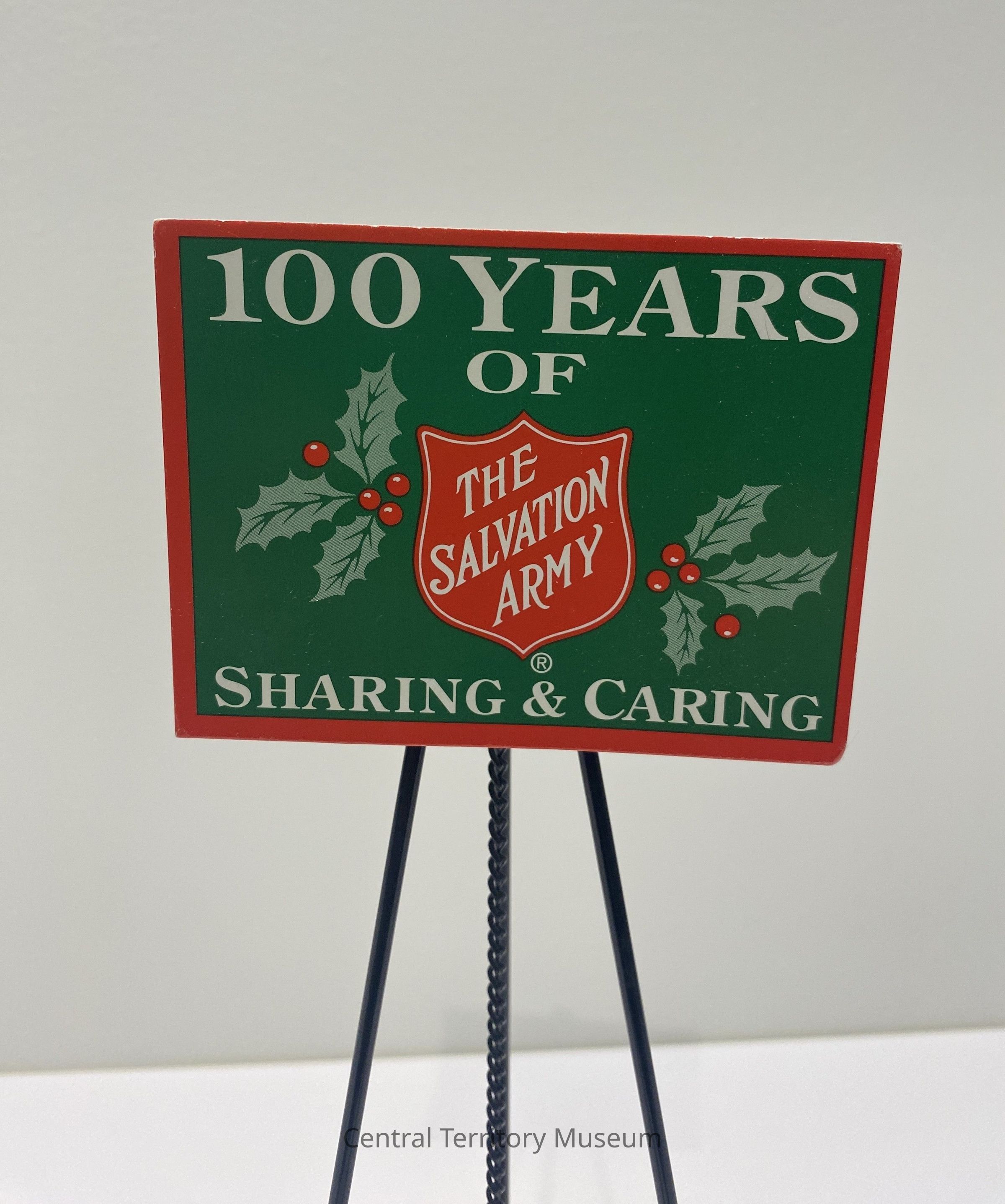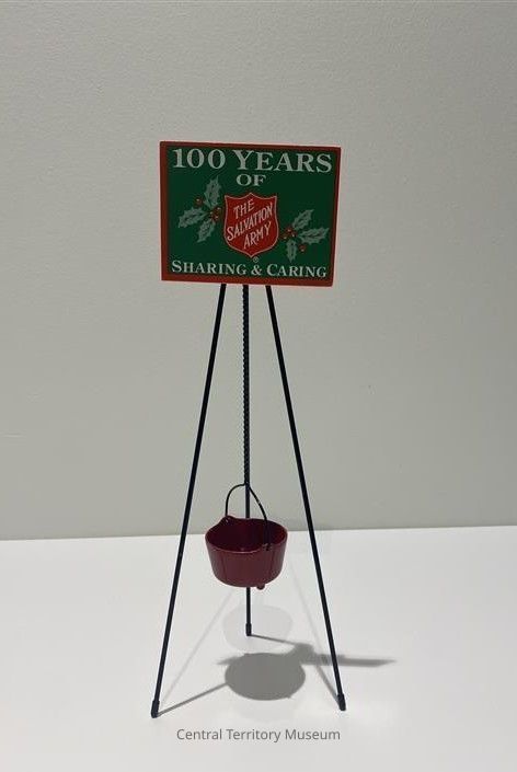 Miniature replica of a kettle stand, red kettle, and a campaign poster. The stand has three black metal legs with black plastic tips. The red metal kettle has a black bail handle and hangs from a black metal chain. The cardstock poster has a red border around a green background. Text on the poster: 100 Years of (above) and Sharing & Caring (below) in white. The center of the poster has a Salvation Army Red Shield, flanked by green holly leaves with red berries. The post is taped to a black metal bar which is part of the black metal piece holding the top of the legs and the top of the chain.Acquisition