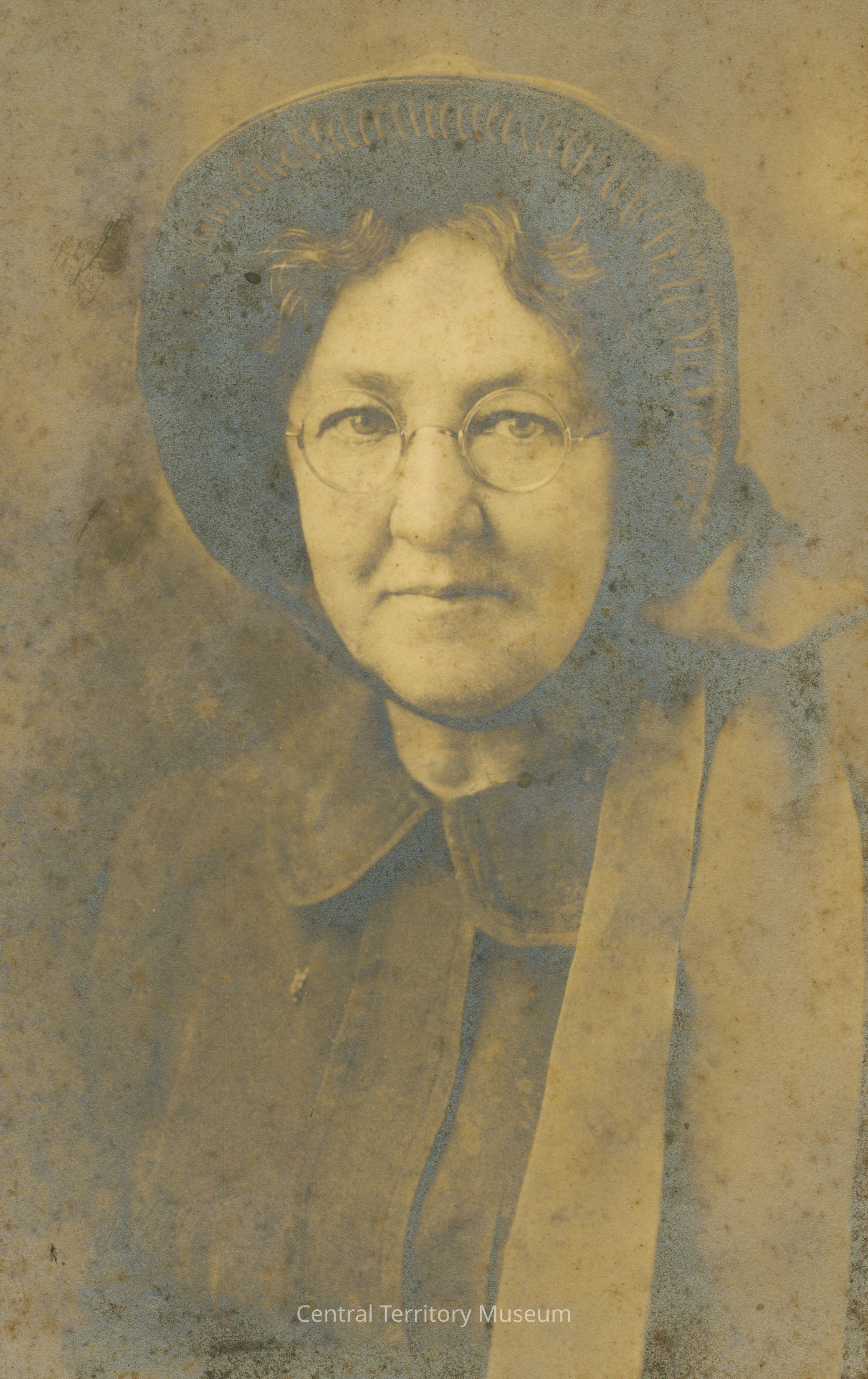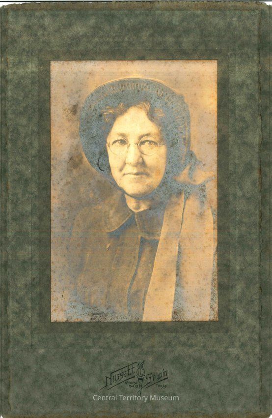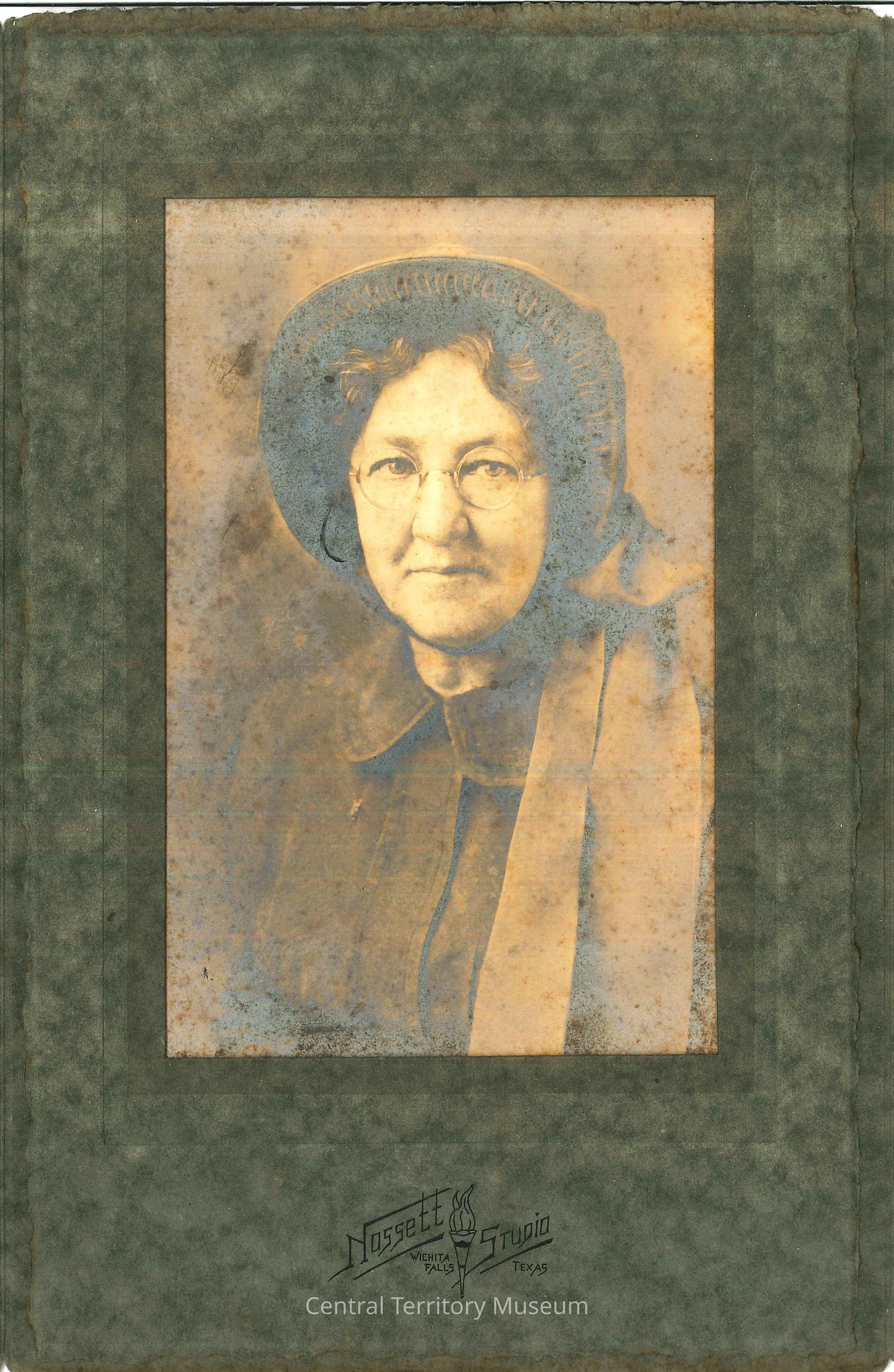 Black and white photograph of Minnie "Ma" Burdick in a tri-fold frame. Frame is a greenish-gray cardstock, both textured and marbled. There is an embossed "N" in the upper lefthand corner of the cover page, which is seen when folded. Ma is wearing her Salvation Army uniform. She is wearing glasses and wears a bonnet. Printed on paper taped below the picture, under the center frame, is "MARY ANN BURDICK/ DIED: 13 Jan. 1934/ My grandmother on my mother's side./ Jean Yates". On the inside of the cover page, in the upper righthand corner, is "Minni Saunders Burdick" written in black ink. Embossed in black on the center of the frame surrounding photograph is "Nossett Studio/ Wichita Falls/ Texas"Acquisition