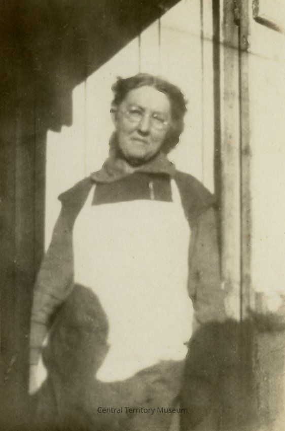 Black and white photograph of Minnie ("Ma") Burdick. She is wearing her WWI Salvation Army uniform with a white apron and glasses. She is standing with her arms at her side, looking directly at the camera. The setting is outside, in front of a wooden wall or door. The photographer's shadow is apparent along the bottom of the photograph. Back of photograph: The number 8 is stamped in black, "Ma Burdick" is written diagonally in red, and "(Demarge/Demange)?" is written in pencil.Acquisition