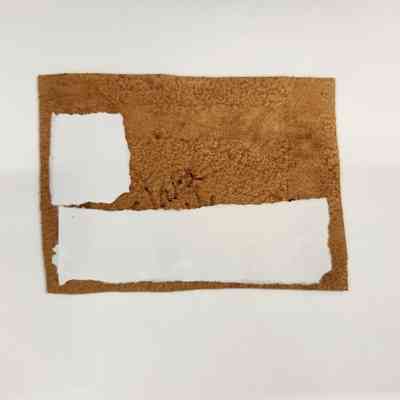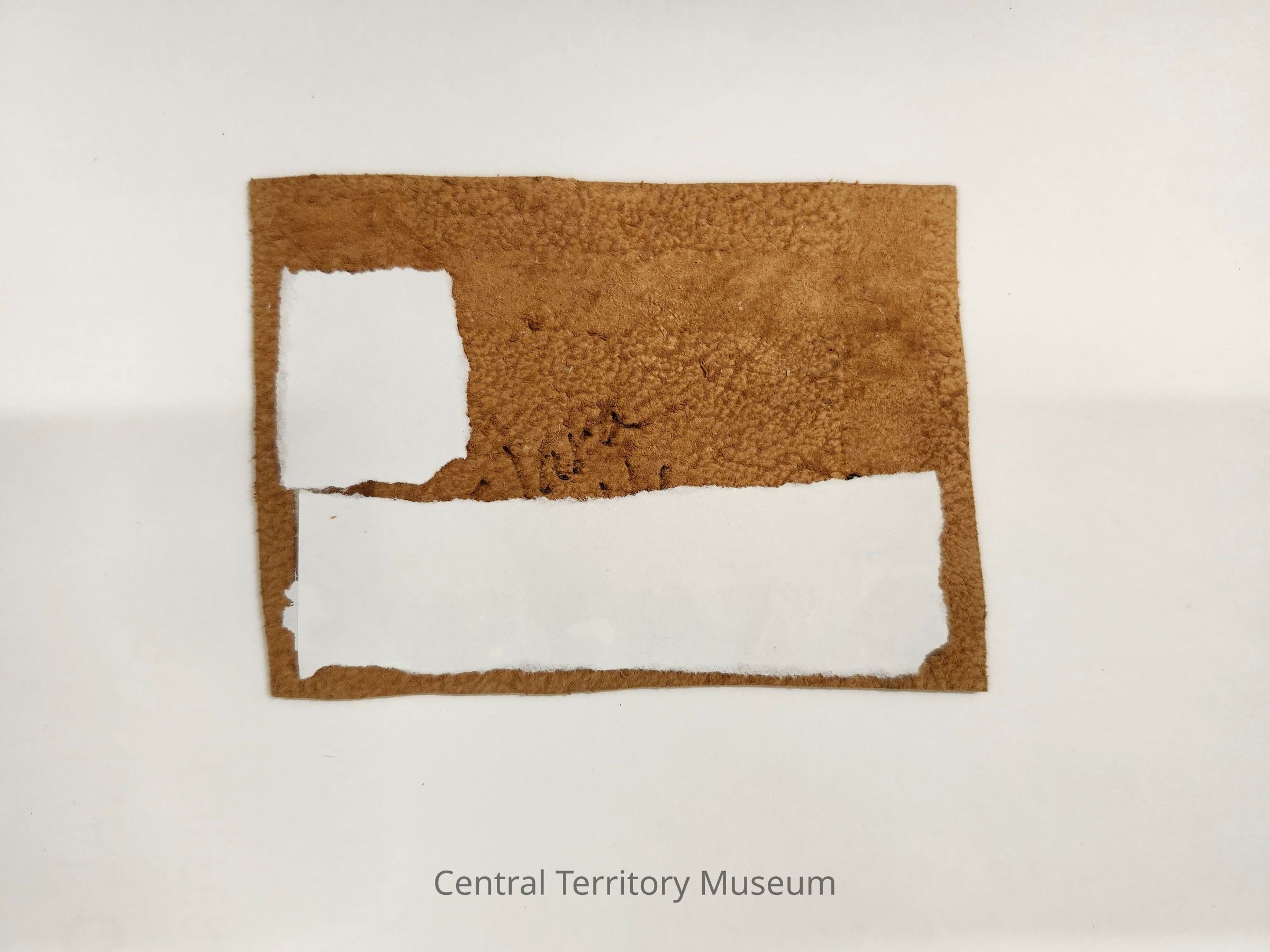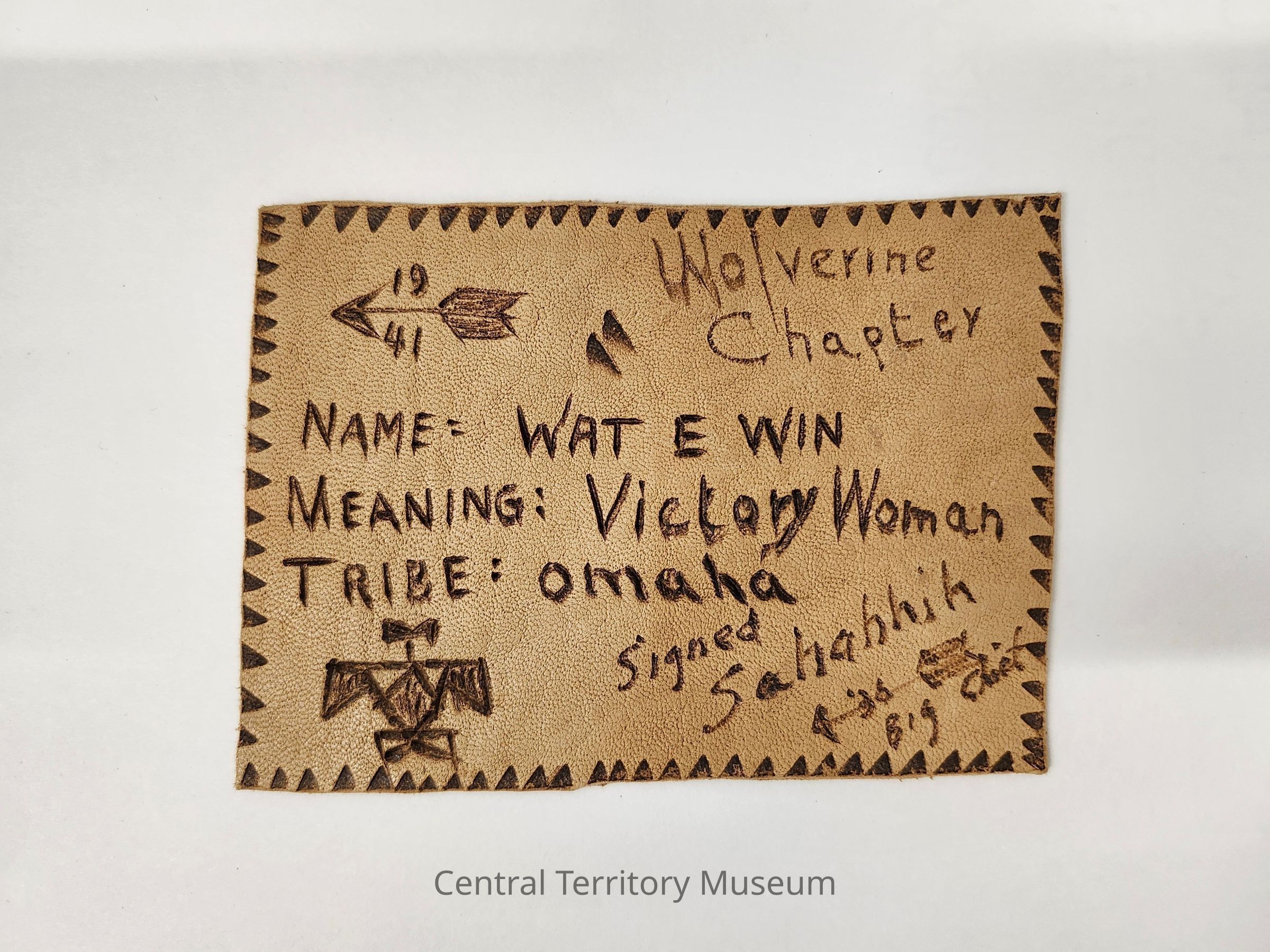 Brown leather nametag issued to Clara (Betts) Muncaster. Dark brown triangles imitate stitch lines around the edge of the tag and the following text is written across the front: