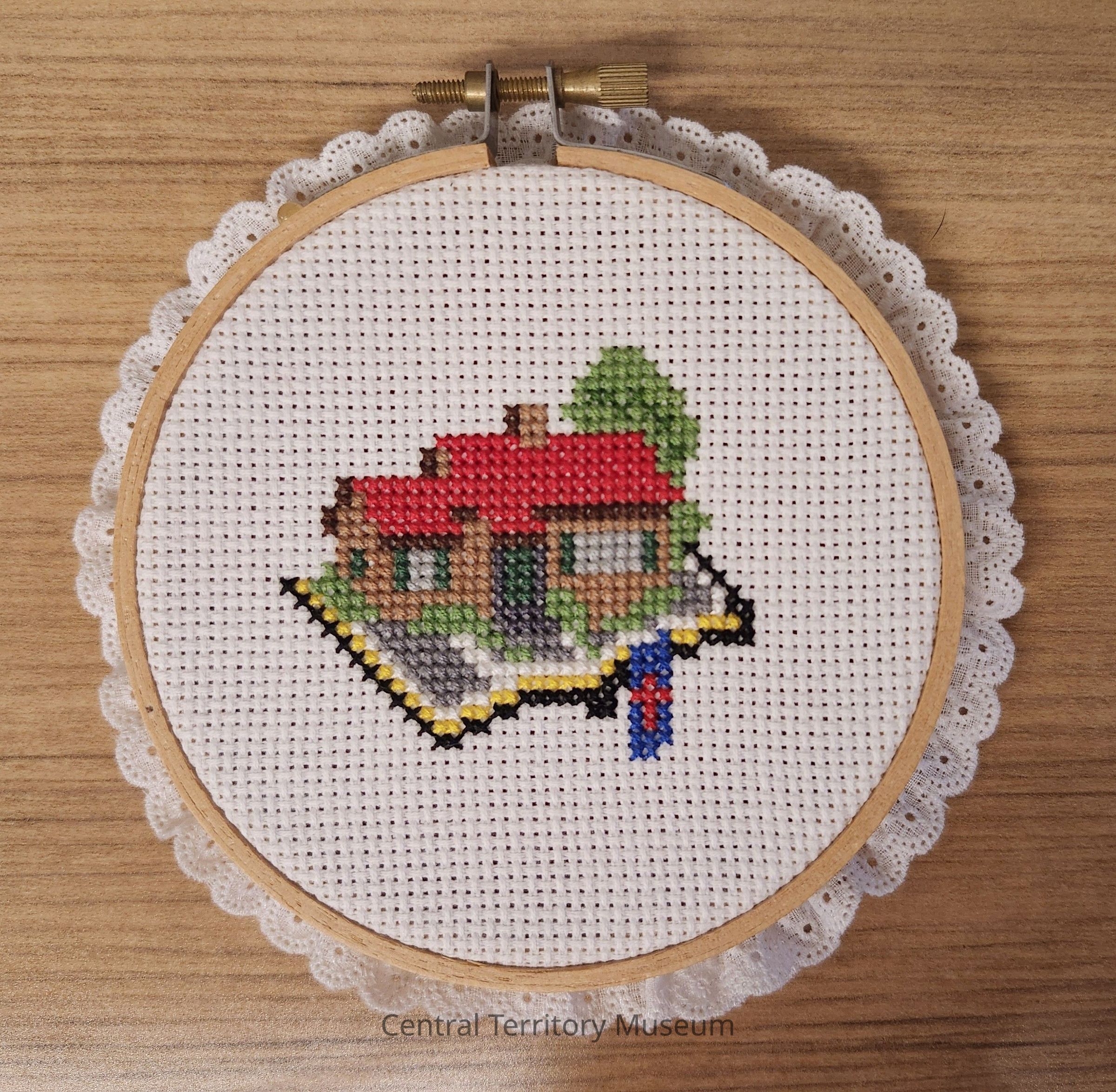 Needlepoint of the Home League logo, framed in a round wood embroidery hoop. The hoop is tightened with a screw clamp. White lace circles the outside edge of the hoop and the back of the piece is covered in red felt.