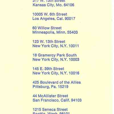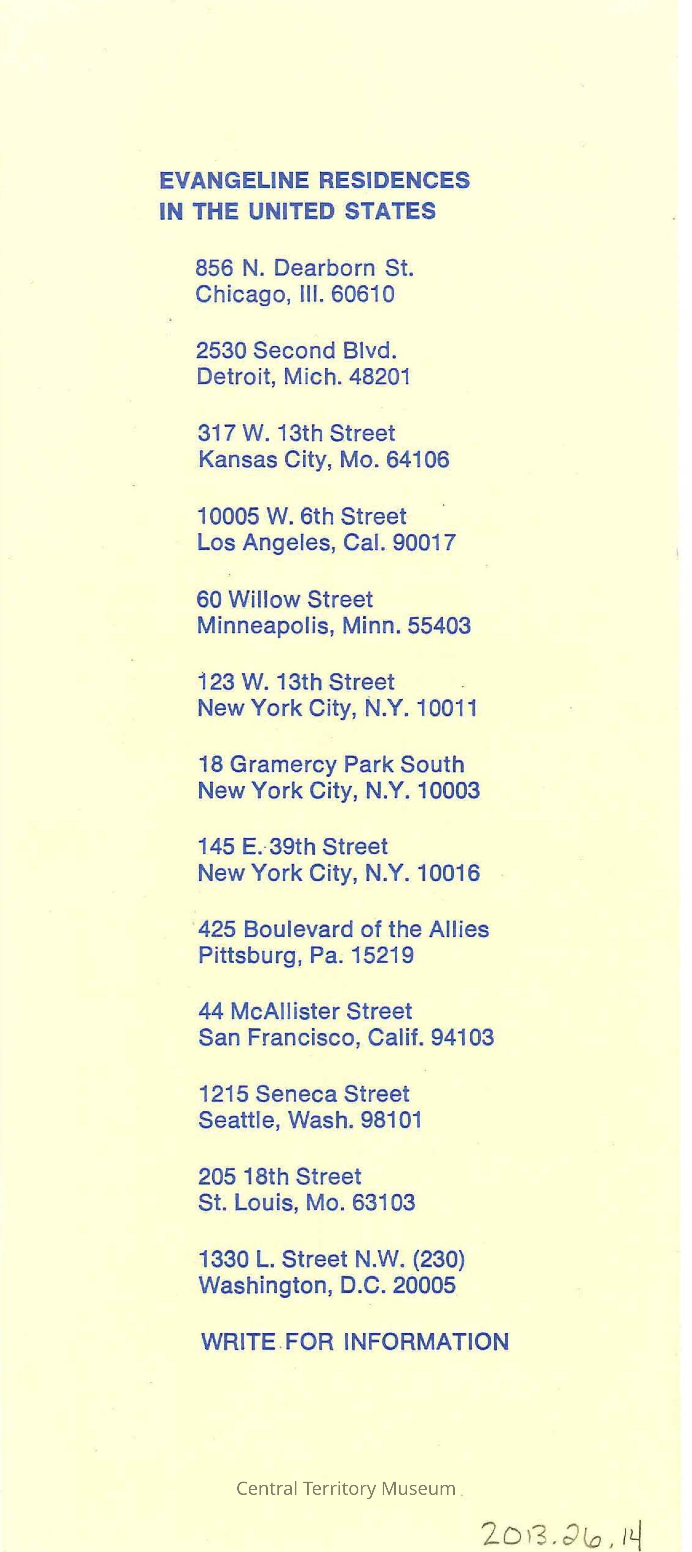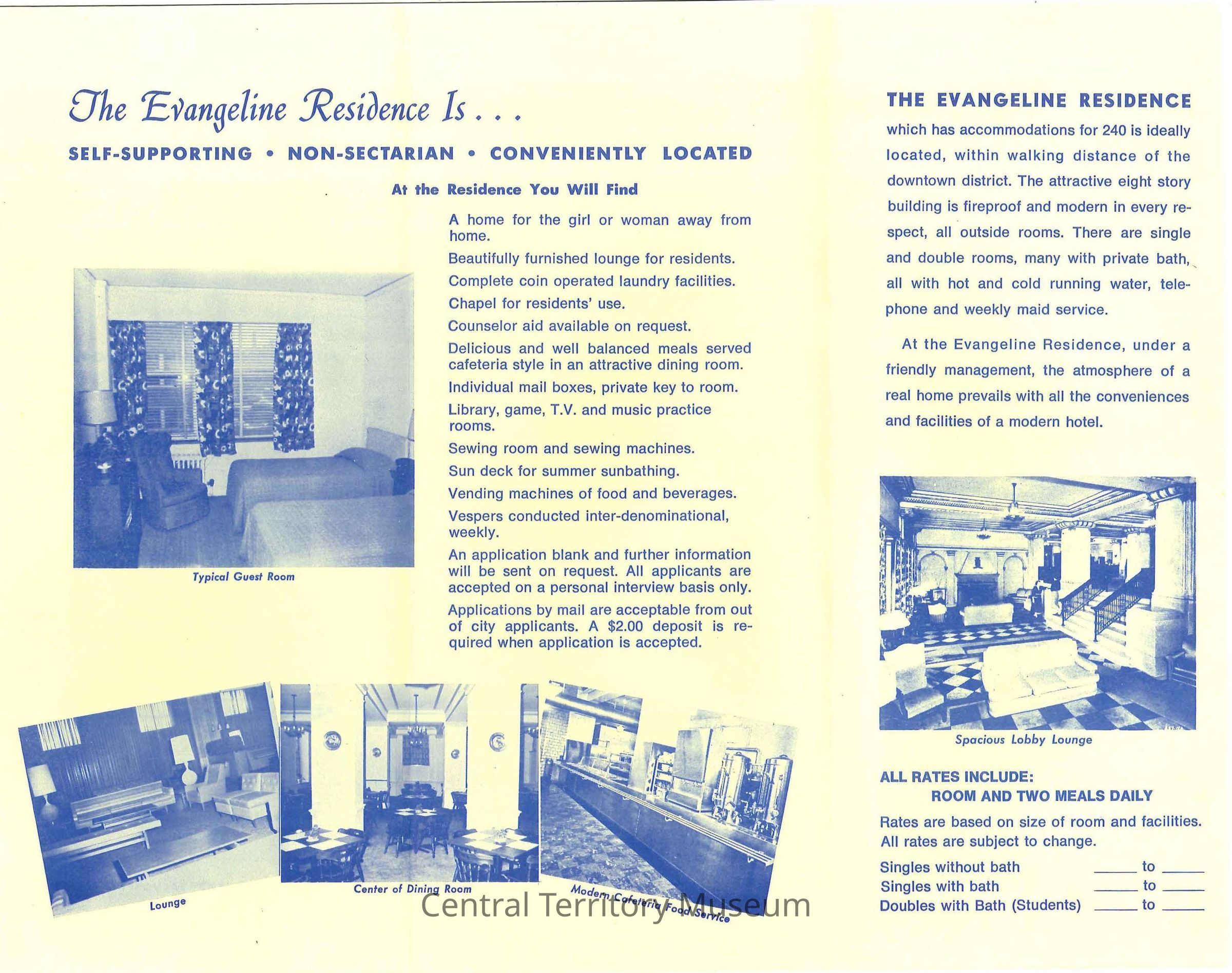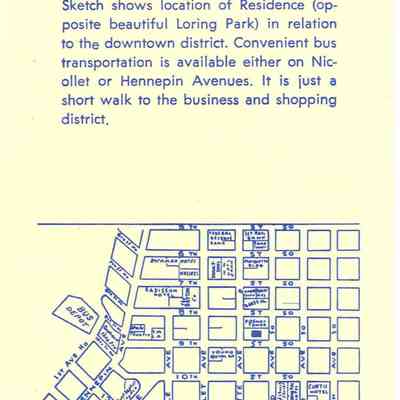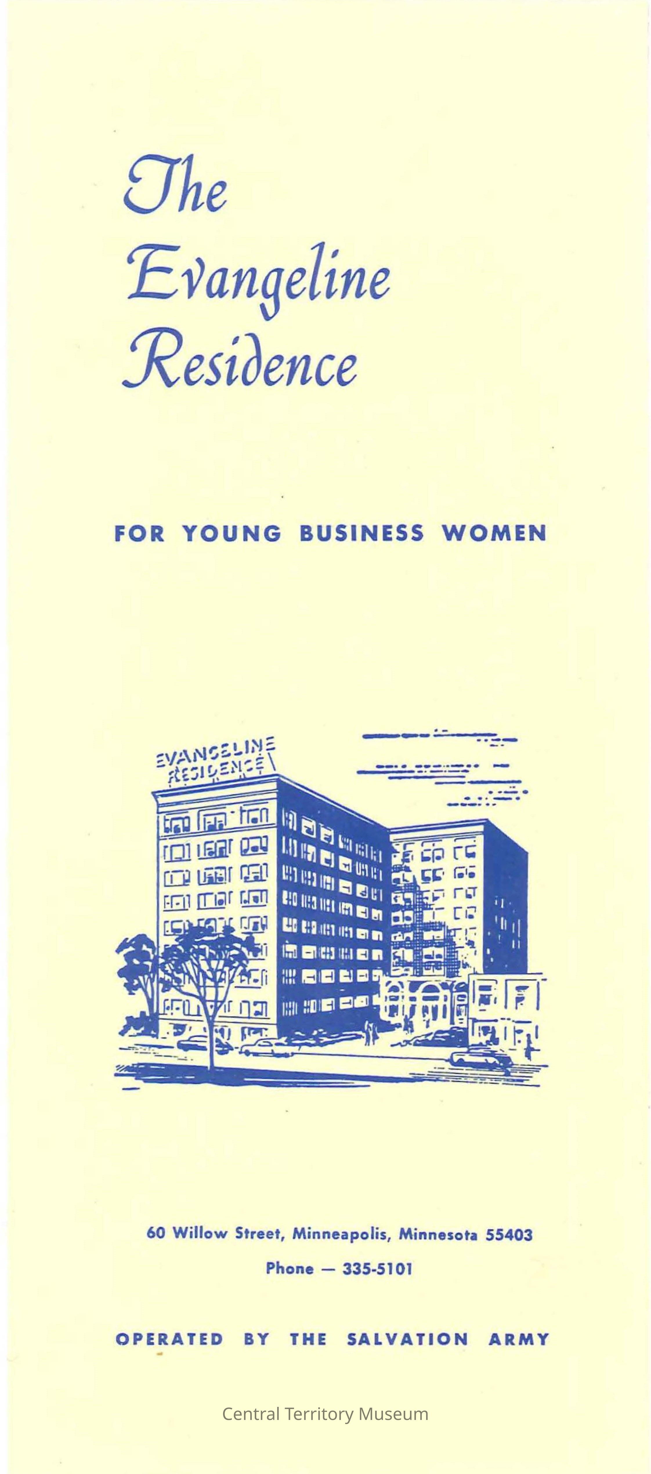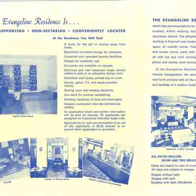 Pamphlet describing living at the The Evangeline Residence for Young Business Women. The front cover has an illustration of the Evangeline Residence in Minneapolis, Minnesota and on the inside, has a map showing the residence in relation to downtown Minneapolis. The back cover has a list of the Evangeline Residences in the United States.