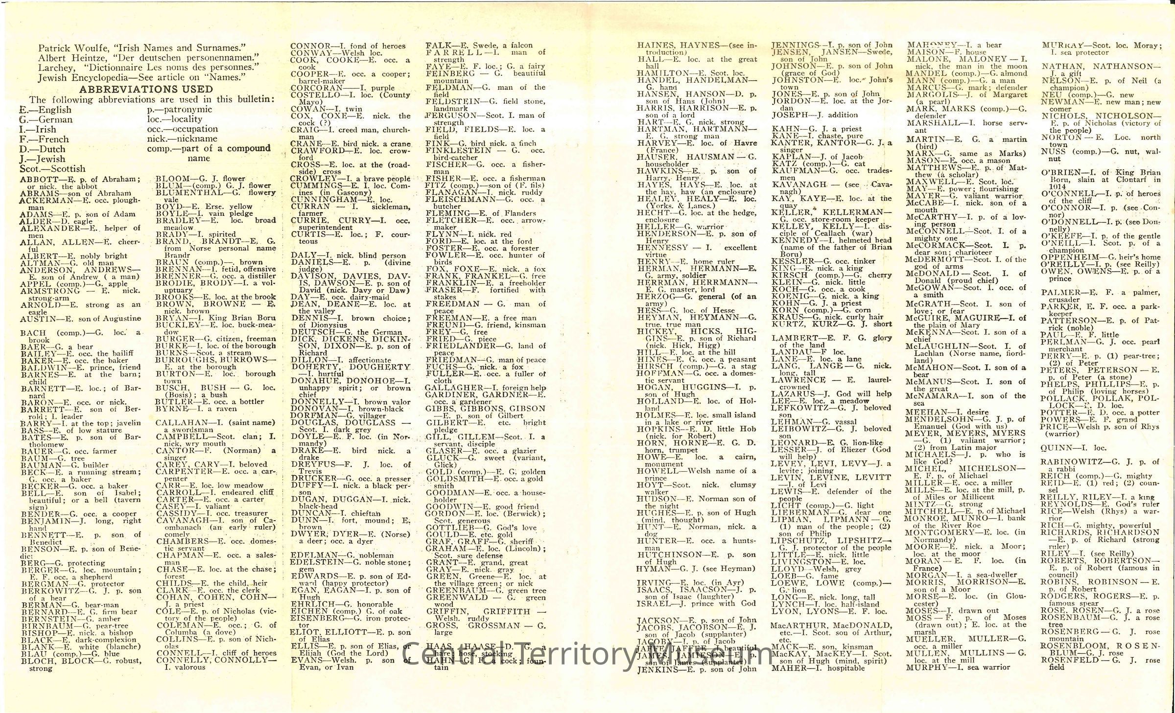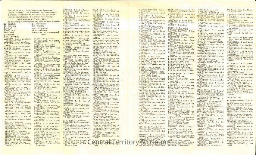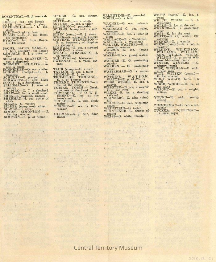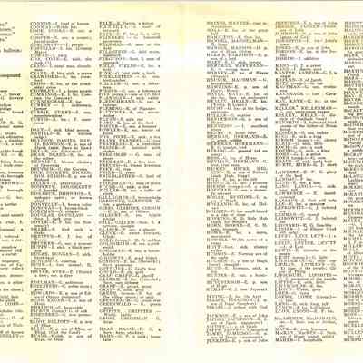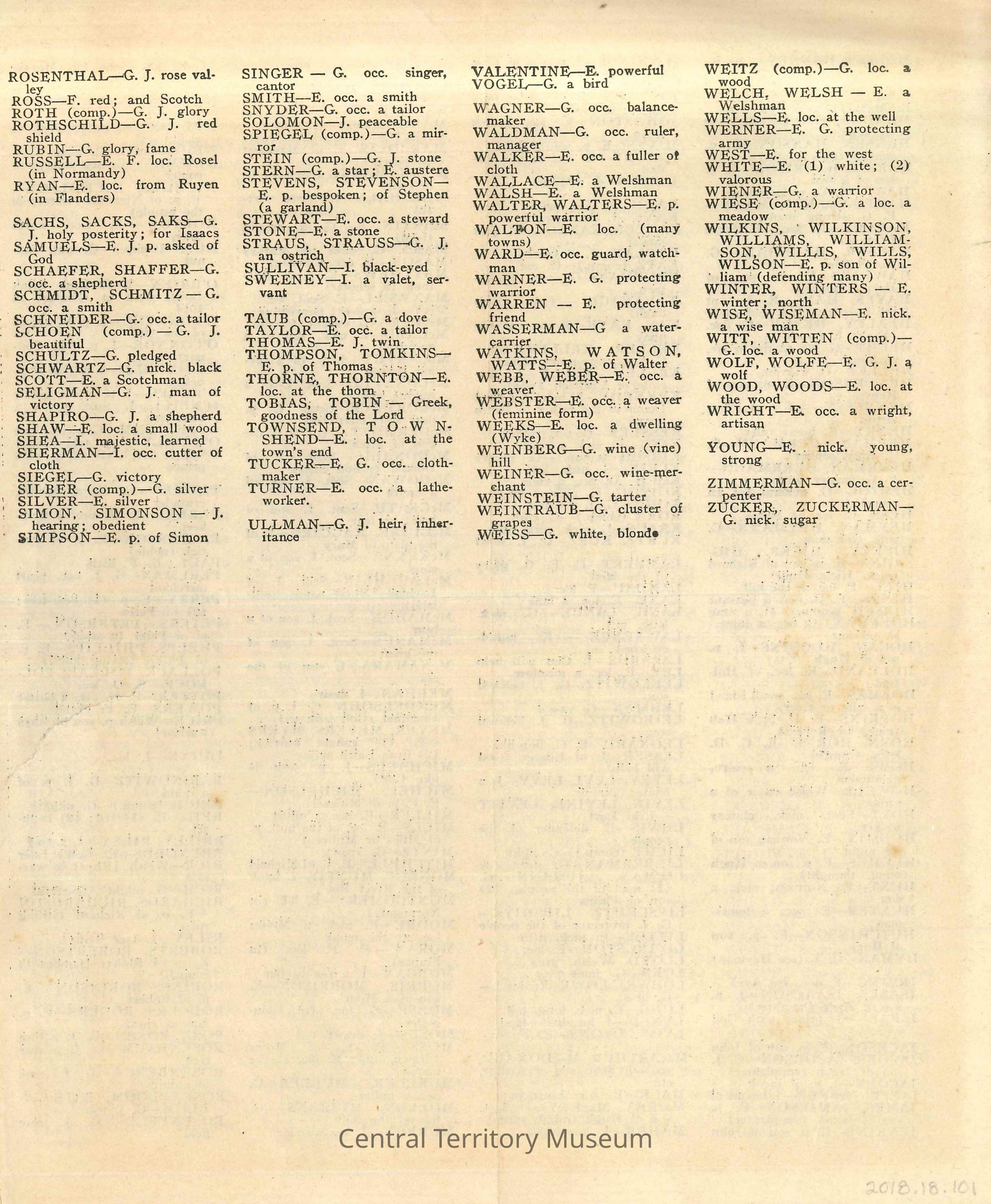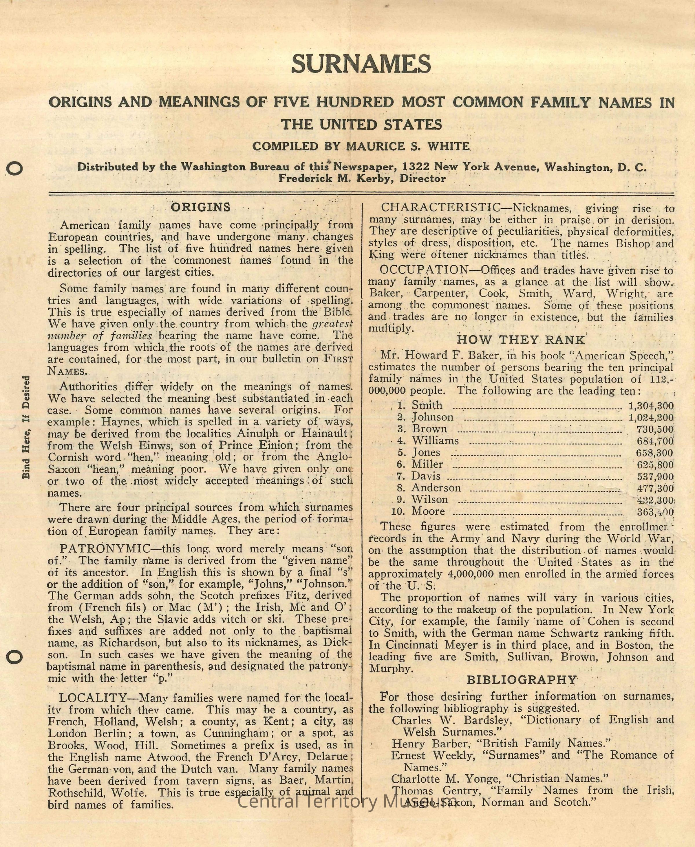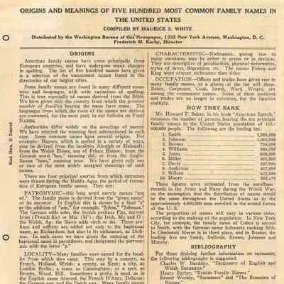 Pamphlet/insert: "SURNAMES/ ORIGINS AND MEANINGS OF FIVE HUNDRED MOST COMMON FAMILY NAMES IN THE UNITED STATES/ COMPILED BY MAURICE S. WHITE/ DISTRIBUTED BY THE WASHINGTON BUREAU OF THIS NEWSPAPER, 1322 NEW YORK AVENUE, WASHINGTON, D. C./ FREDERICK M. KIRBY DIRECTOR.