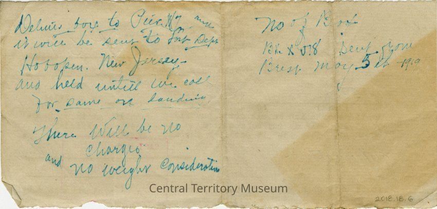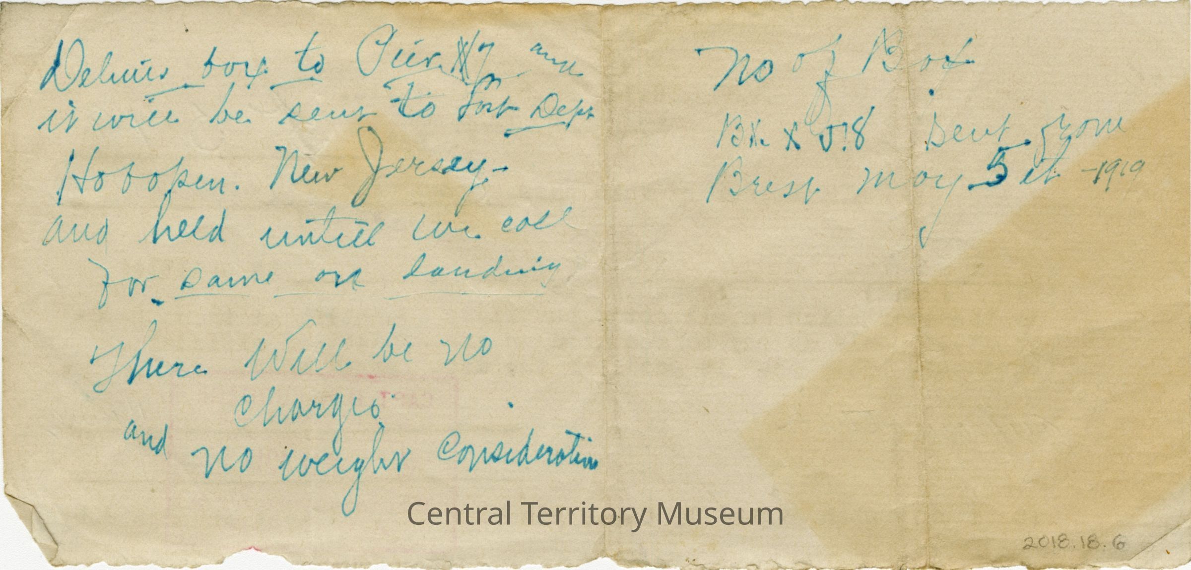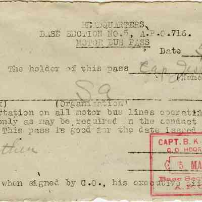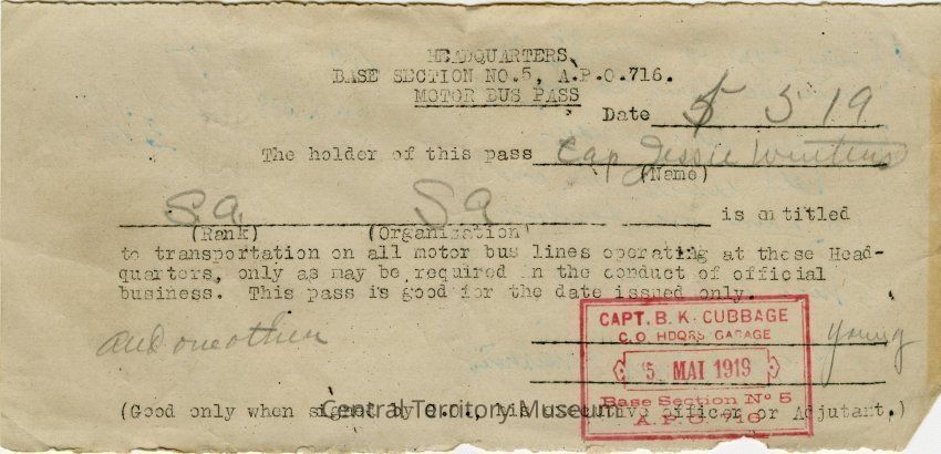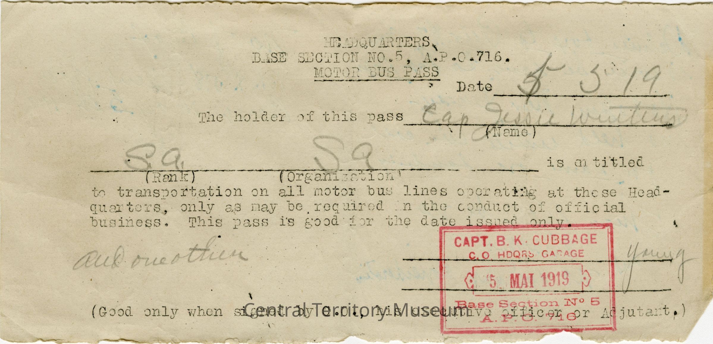 Motor bus pass assigned to Captain Jessie Winters of the Salvation Army on May 5, 1919. The header/title of the document reads: "HEADQUARTERS/ BASE SECTION NO.5, A.P.O.716./ MOTOR BUSS PASS". The pass allowed Winters transportation on all motor bus lines at those headquarters. It was for official business purposes and was only valid that day. Probably war related. The headquarters referred to on this pass appear to be the headquarters for the American Expeditionary Forces (A.E.F.) in Brest, France. Typed black ink on white/cream paper. The blank spaces are filled out with pencil. Towards the lower righthand corner is a rectangular stamp printed in red ink that reads: "CAPT. B. K. CUBBAGE/ C.O. HDQRS GARAGE/ 5 MAI 1919/ BASE SECTION NO 5/ A.P.O.716". A note (somewhat illegible) is written in blue ink on the back of the pass. On the left: [DELIVER] [BOX] TO [PIER] [#7] AND [IT] WILL BE [SENT] TO [???] [DEP?] HOBOKEN, NEW JERSEY - AND [HELD] UNTIL [WE] [CALL] FOR [?A?E] [ON] [??????]. THERE WILL BE NO CHARGES AND NO [?????] CONSIDERATIONS On the right: NO OF BOX [BX] X [??8] [SENT] [FROM] [BREST] MAY 5TH - 1919