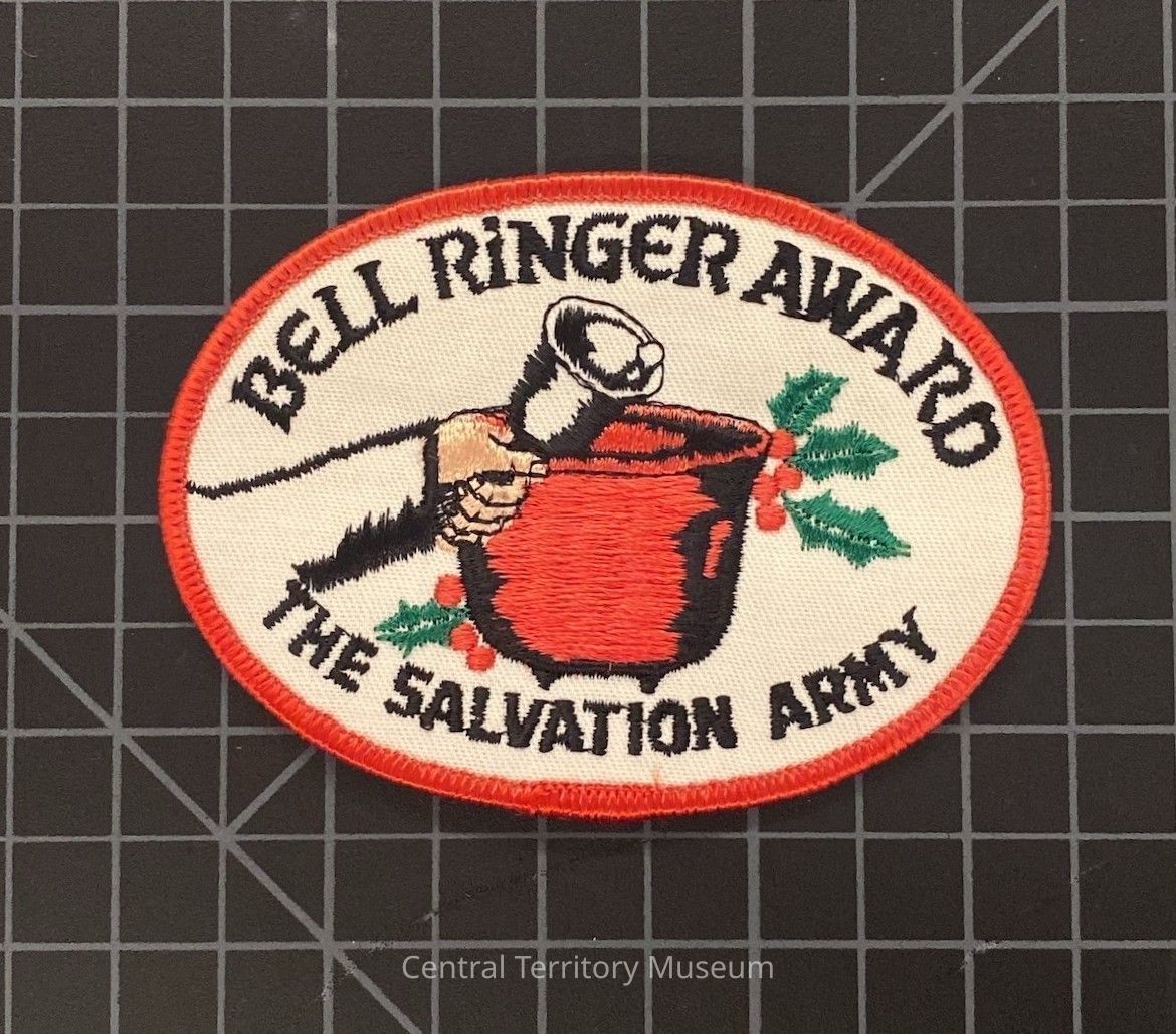 Patch, Bell Ringer Award. The oval shaped patch has a red embroidered border with text: Bell Ringer Award above and The Salvation Army below in black. A red kettle is in the center with holly leaves and berries decorating it. And an arm, outlined in black, with a peach colored hand, is ringing a bell on the left side.