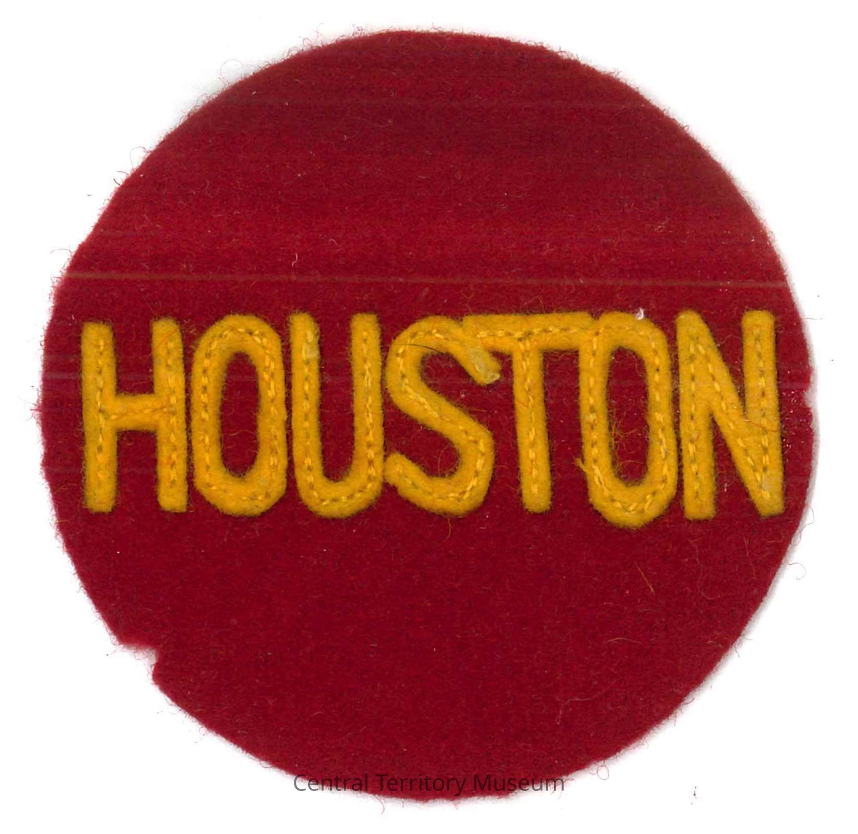 Patch used/owned by the Burdicks. Round, red felted wool patch with "HOUSTON" stitched to the backing in yellow wool.