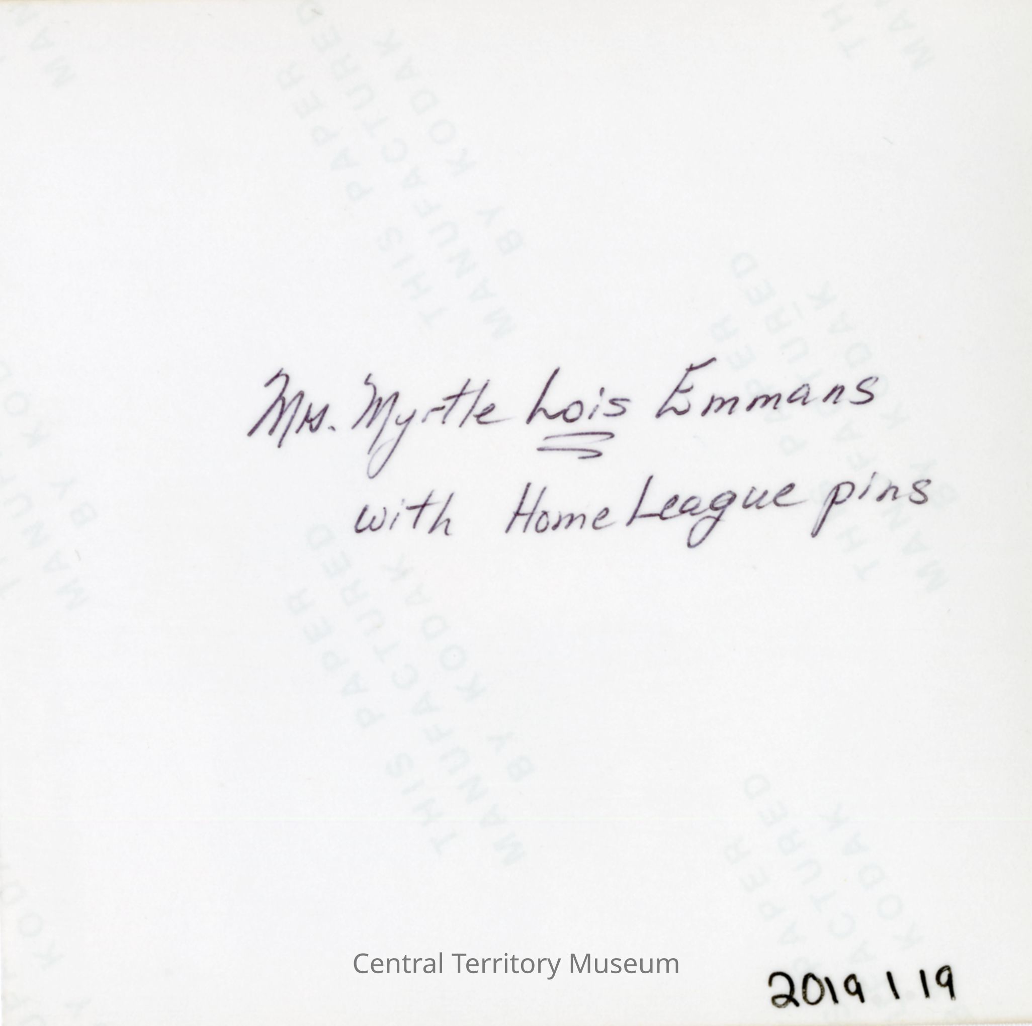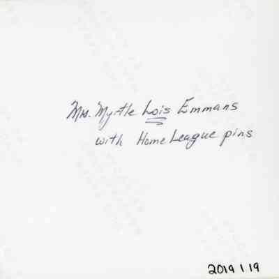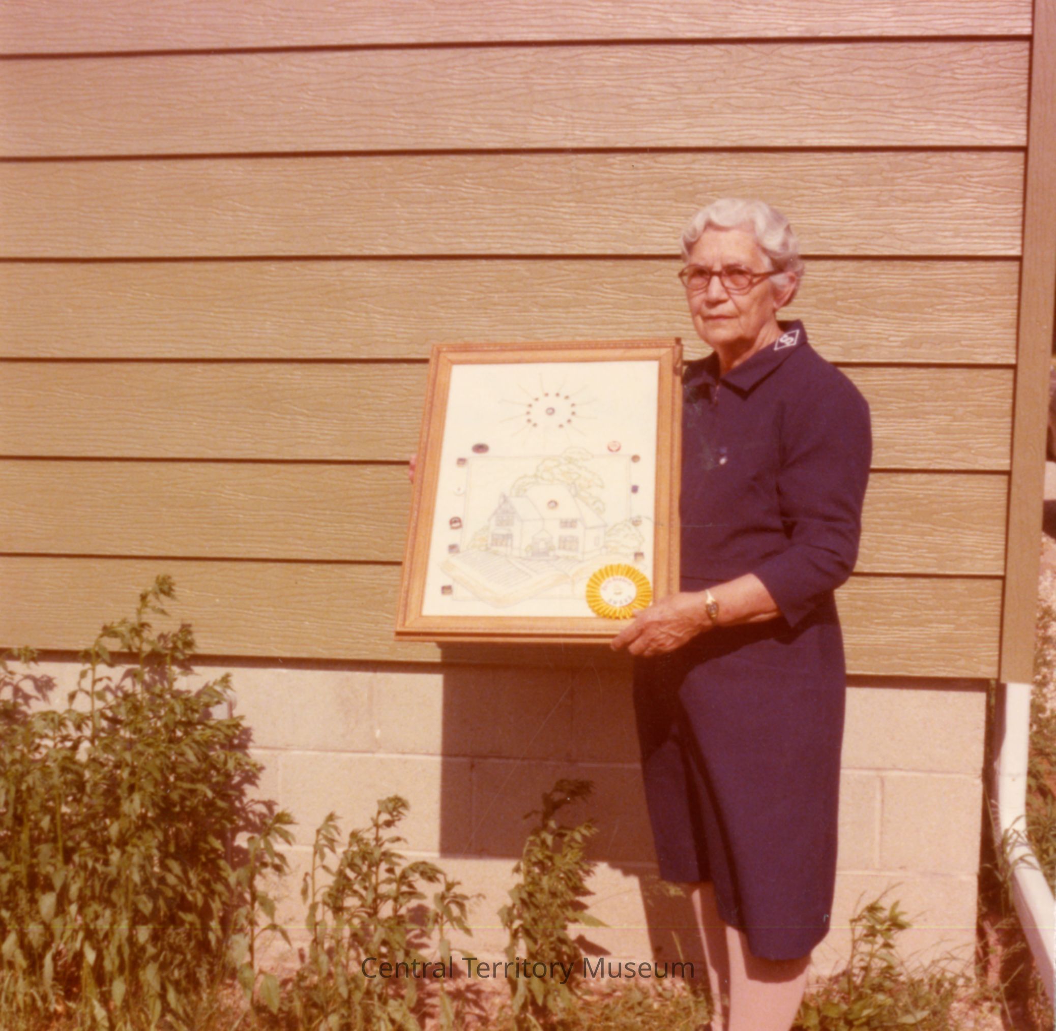 Color photo print showing a woman wearing a Salvation Army dress with Soldier insignia on the collar. The woman poses outside of a building and is holding a framed piece of needlework. On back of photo the subject is identified as "Mrs. Myrtle Lois Emmans with Home League Pins"