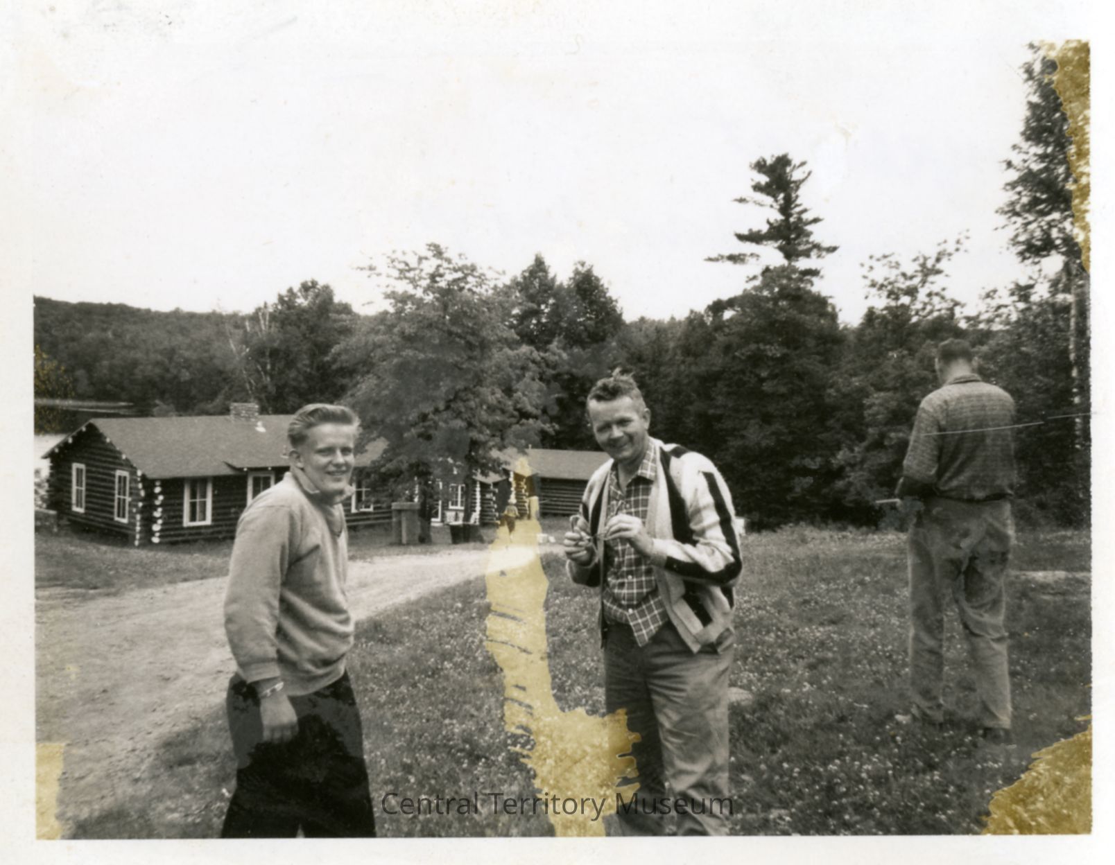 Snapshot of two unidentified men at Hanging Horn Camp. A third man, back to the photographer, can be seen on the right. Two log cabin style buildings can be seen in the background.