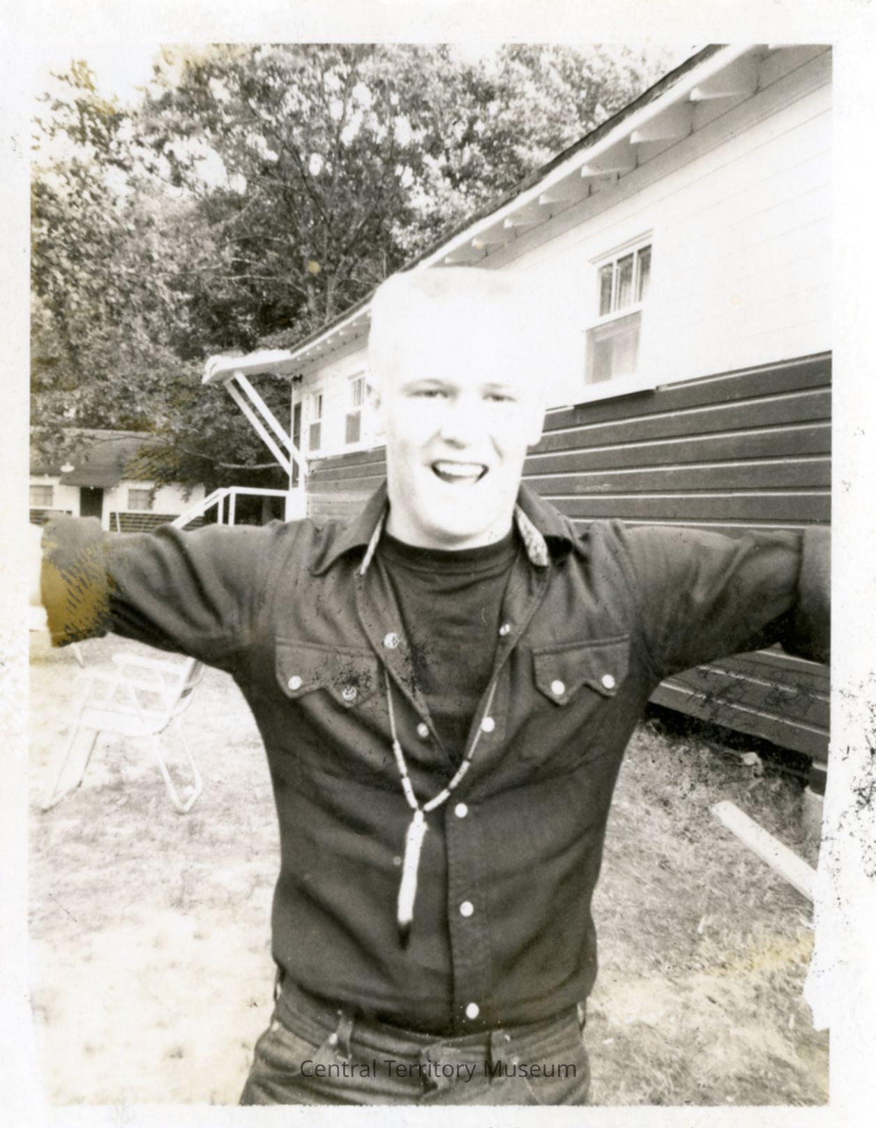 Snapshot of an unidentified young man, standing next to a camp building. He has blond hair, crew cut style, and is wearing a dark button up shirt over a dark t-shirt and denim pants. He is wearing a necklace, similar to a Black Arrow style regalia, around his neck.