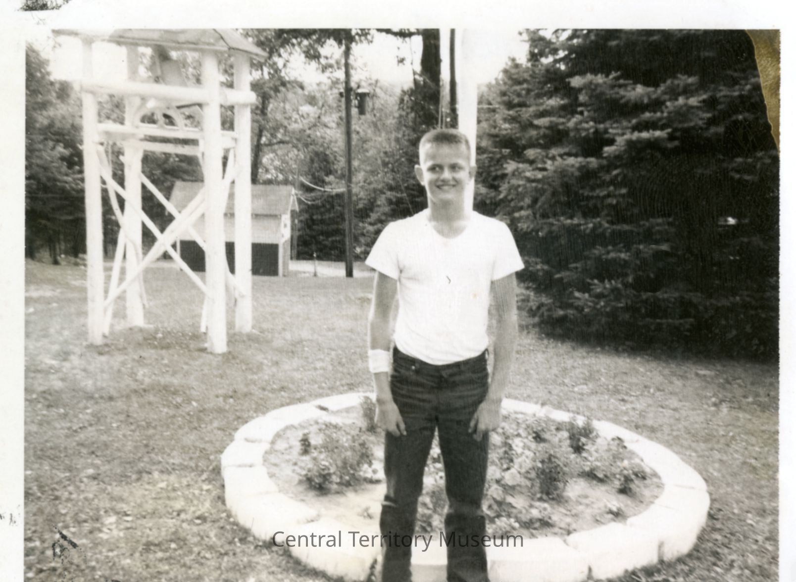 Snapshot of a young man outside at camp. He has blond hair, cut in a crew cut style, and is wearing a white t-shirt and dark denim pants. Various camp structures can be seen behind him.