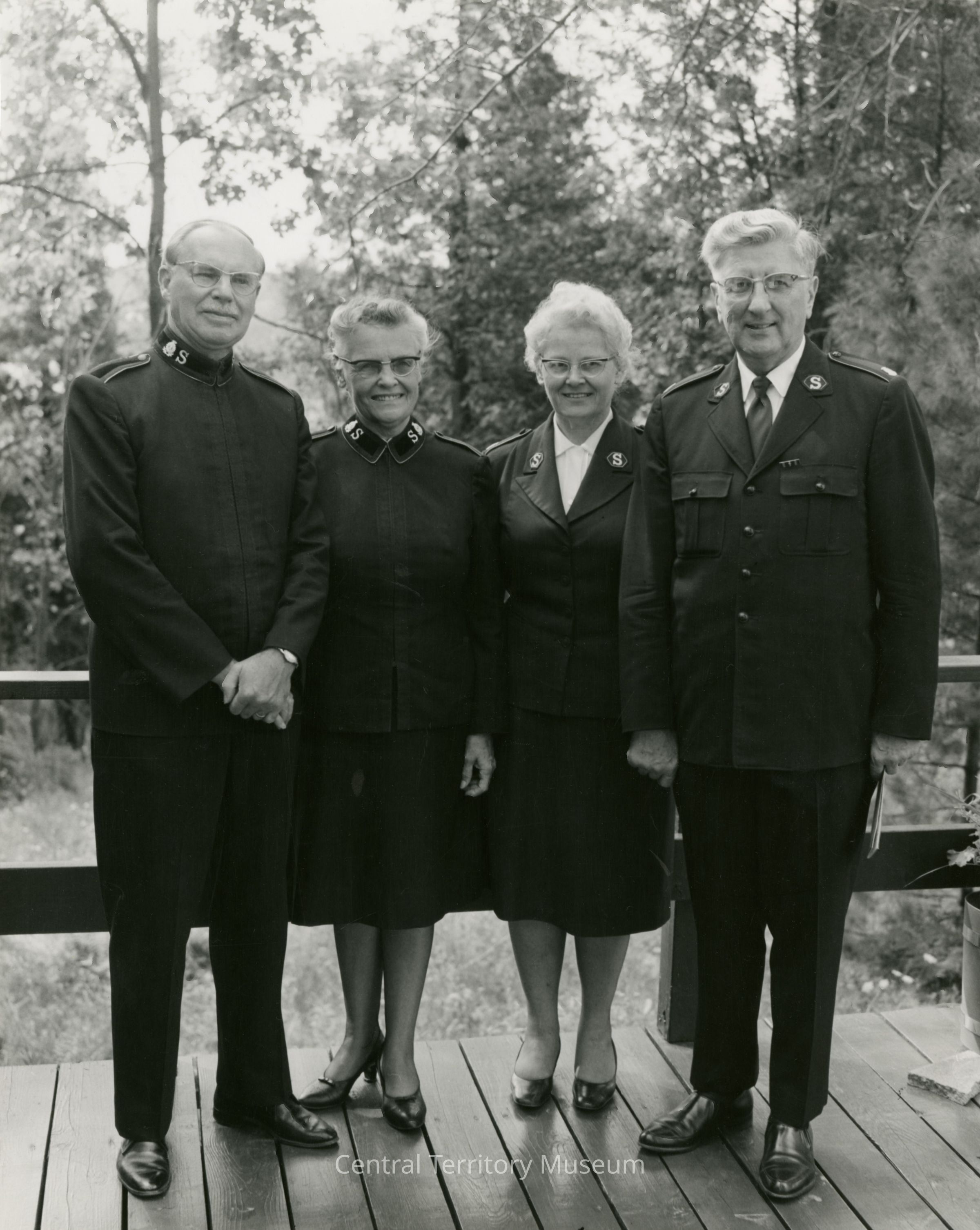 Photograph of Commissioner Clarence Wiseman, Janet Wiseman, Elsie Franzen, and Stig Franzen during a pilgrimage at Echo Grove Camp. The four officers are wearing their uniforms and posing on a wooden bridge amongst the trees.