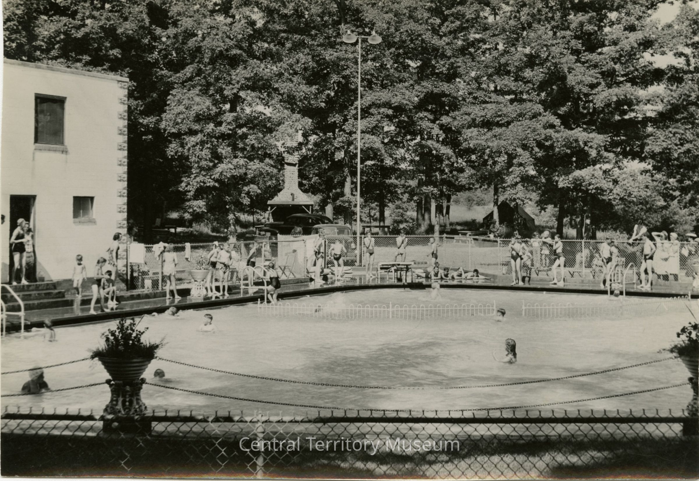 Photograph of boys and girls swimming in the pool at Echo Grove Camp. A chain link fence surrounds the pool and a two story white building can be seen on the left side of the photo with swimmers standing in the doorway. In the background are two cars, a large outdoors fireplace and a cabin.