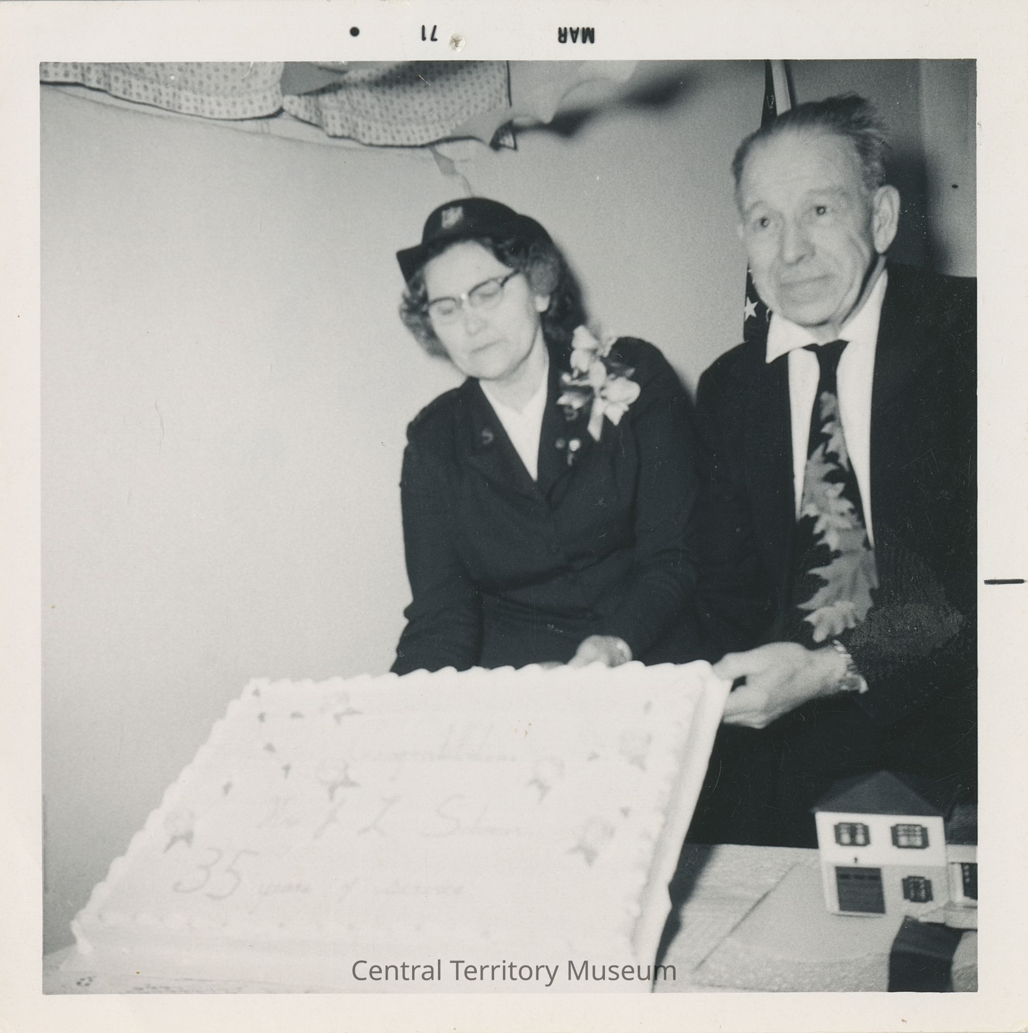 Photo of a woman and a man, holding a sheet cake. Most of the inscription is not legible but the last line reads 35 Years of Service. The woman is wearing a Salvation Army uniform with a corsage pinned at the shoulder. The man is wearing a dark suit, white shirt, and a tie with a dark background and lighter design.
