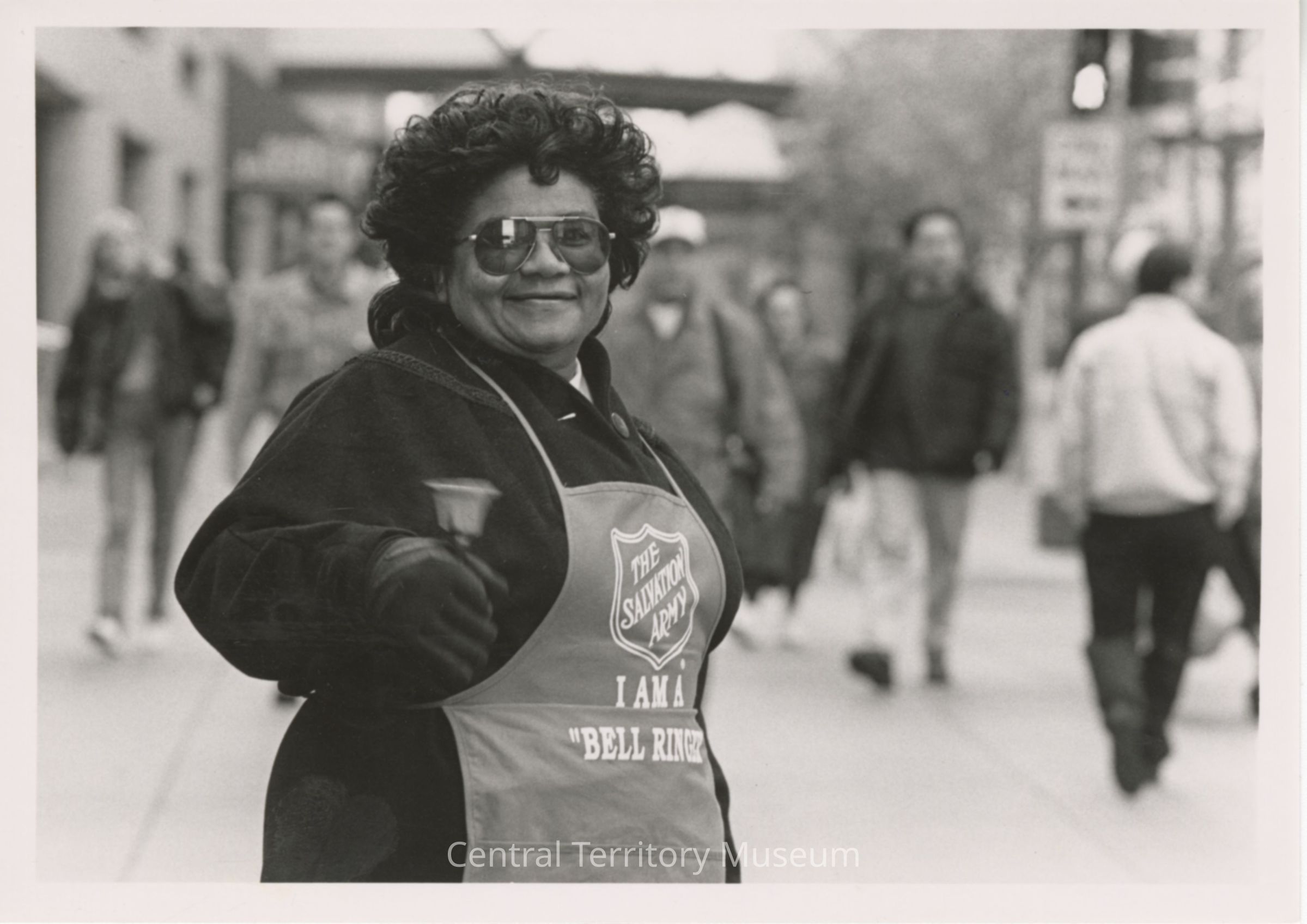 Photo of Annie Mae Hester, a Salvation Army bell ringer, ringing her bell during a Red Kettle Campaign in Minneapolis, Minnesota. Crowds of people can be seen in the background. Hester is a Black woman with dark curly hair, wearing a dark winter coat with a red bib style apron over. The apron has a Red Shield logo with The Salvation Army printed on it and under the shield it reads I Am A Bell Ringer.
