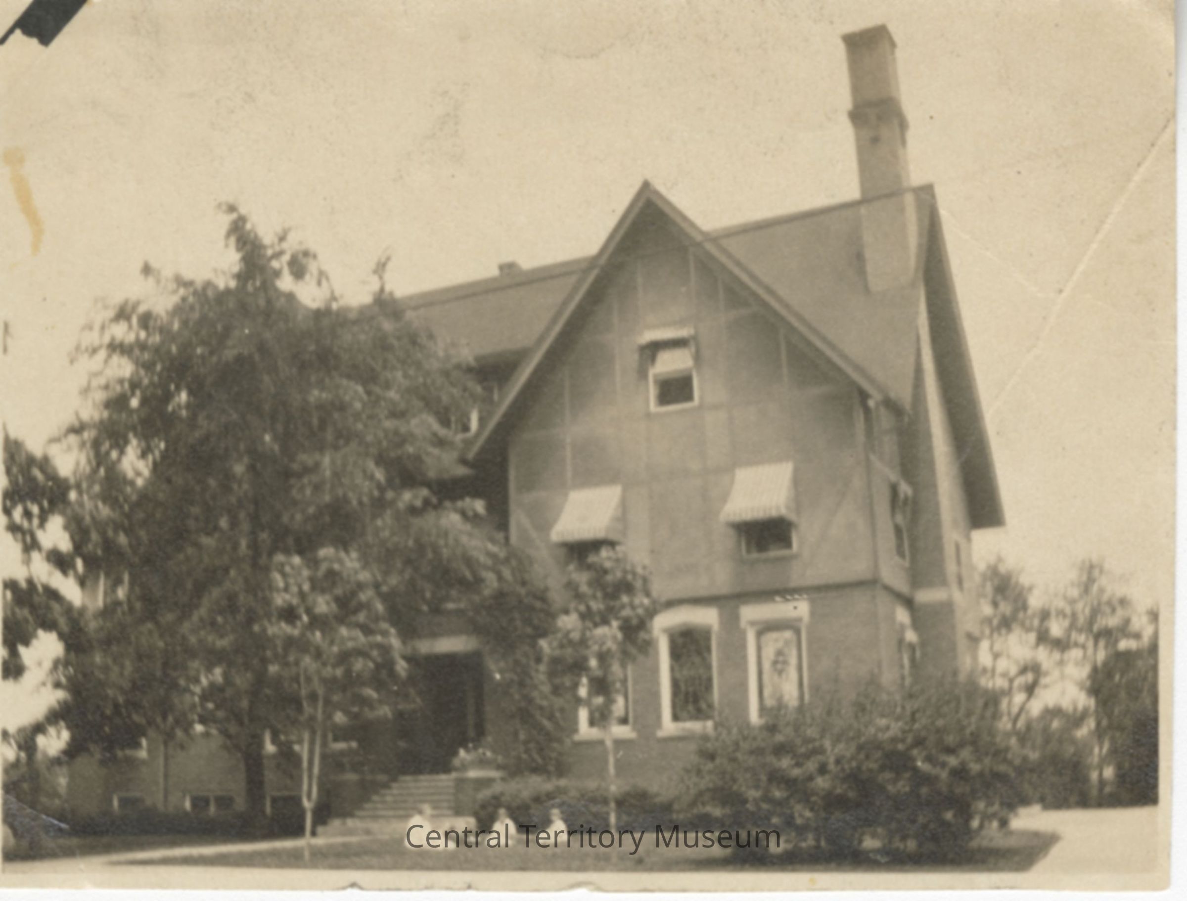 Photo of the Evangeline Home and School for Girls, 1215 E. Fulton Street, Grand Rapids, Michigan. A woman and three children, all dressed in white, can be seen sitting on the lawn in front. Three stained glass windows are visible in the building, just behind the group; The Evangeline Home was built in 1912.Acquisition