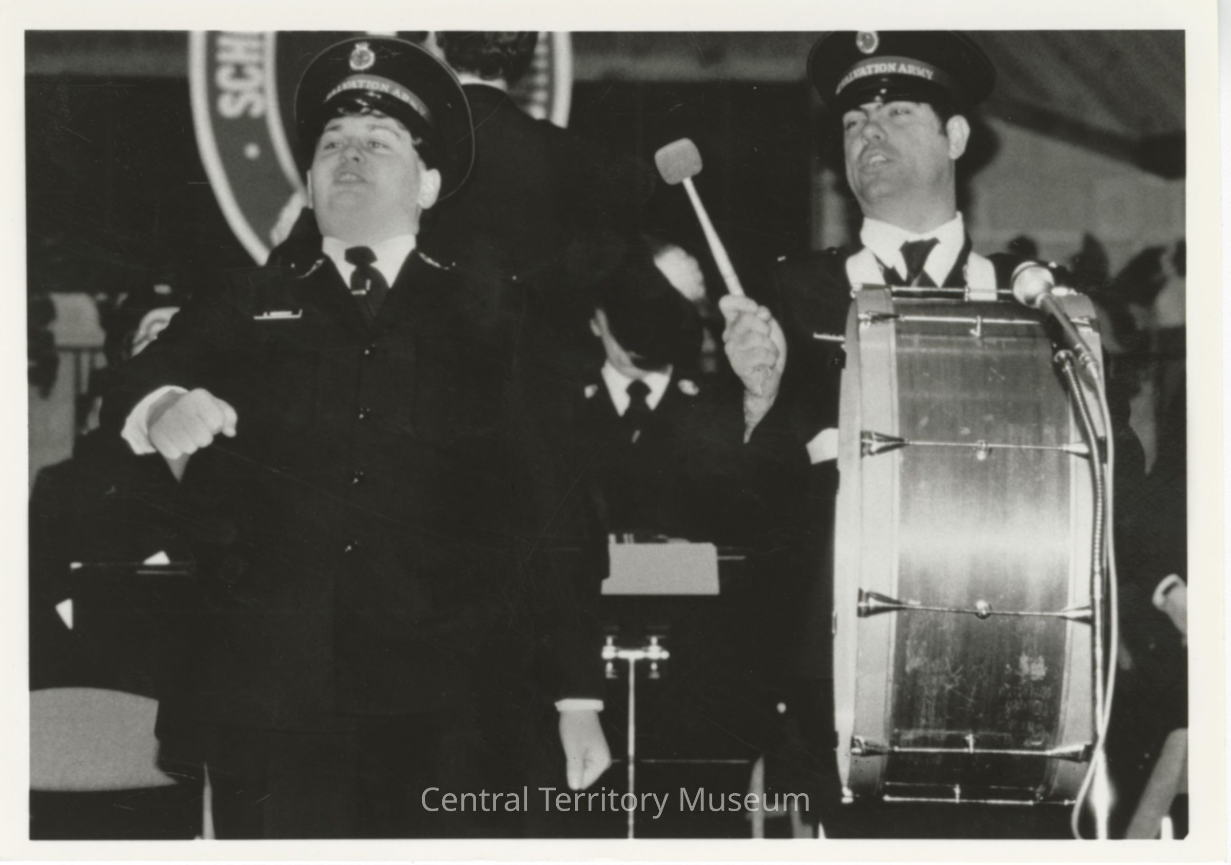 Photo of Cadet Graeme Midinsky and another male cadet during the Future Officers' Fellowship weekend. A typed caption on the back reads "Cadet Graeme Midinsky in the dramatic encounter with Light-Fingered Freddie". The man on the right side is holding a drum and a drumstick in his right hand.