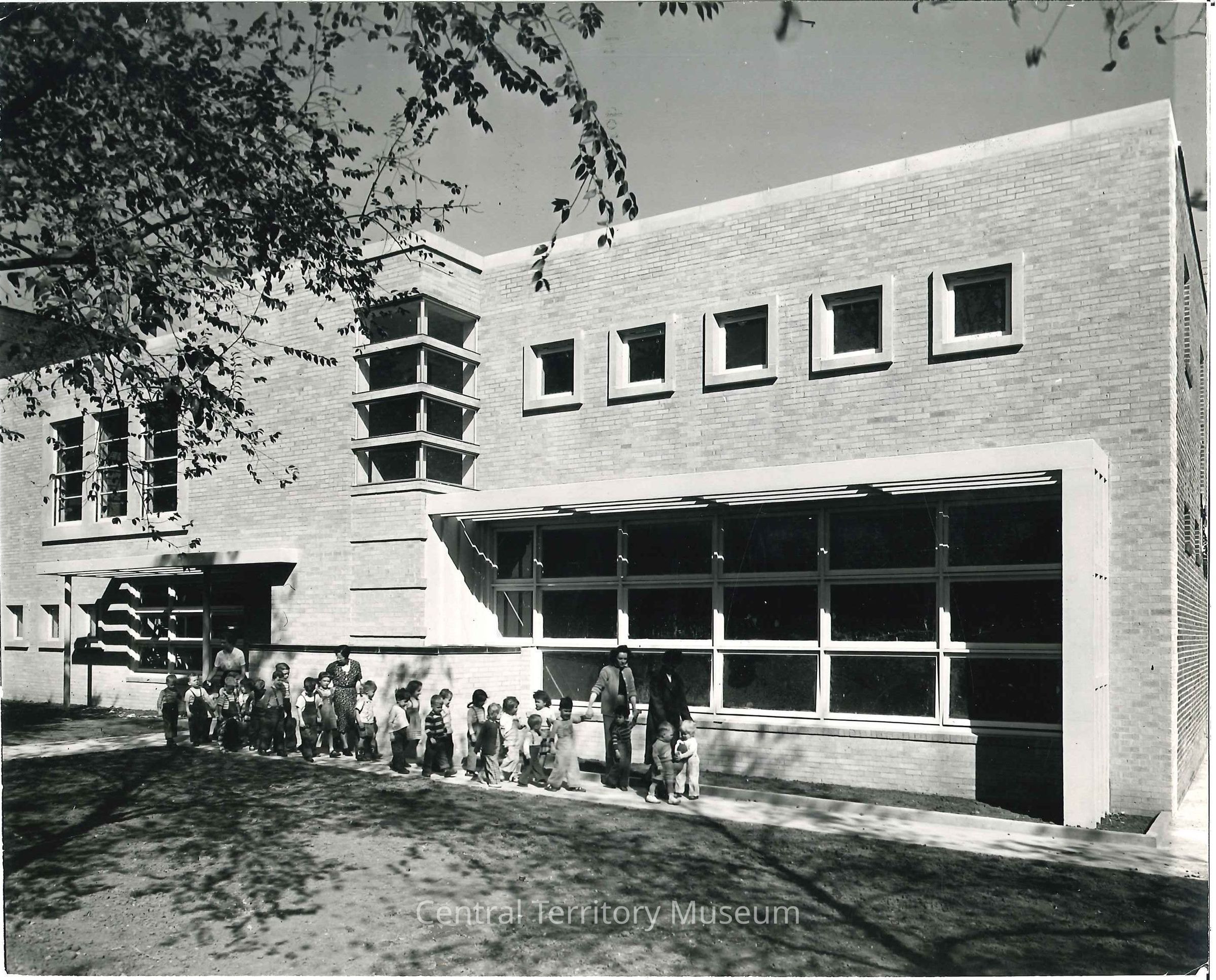 Photo of the Kansas City, Missouri Nursery building. A group of boys and girls and women are lined up on the sidewalk in front of the building. A typed caption on the back of the photo reads: "view of Salvation Army Red Shield Nursery. Kansas City, MO. October 9. 1949."