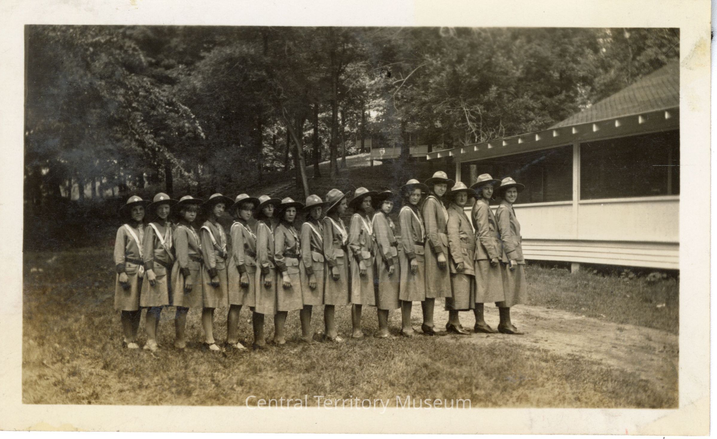 A black and white photograph of Girl Guards, in uniform, standing outside of a cabin at Camp Elm. The back of the photo has a handwritten inscription: "Guard Camp Indianapolis Camp".