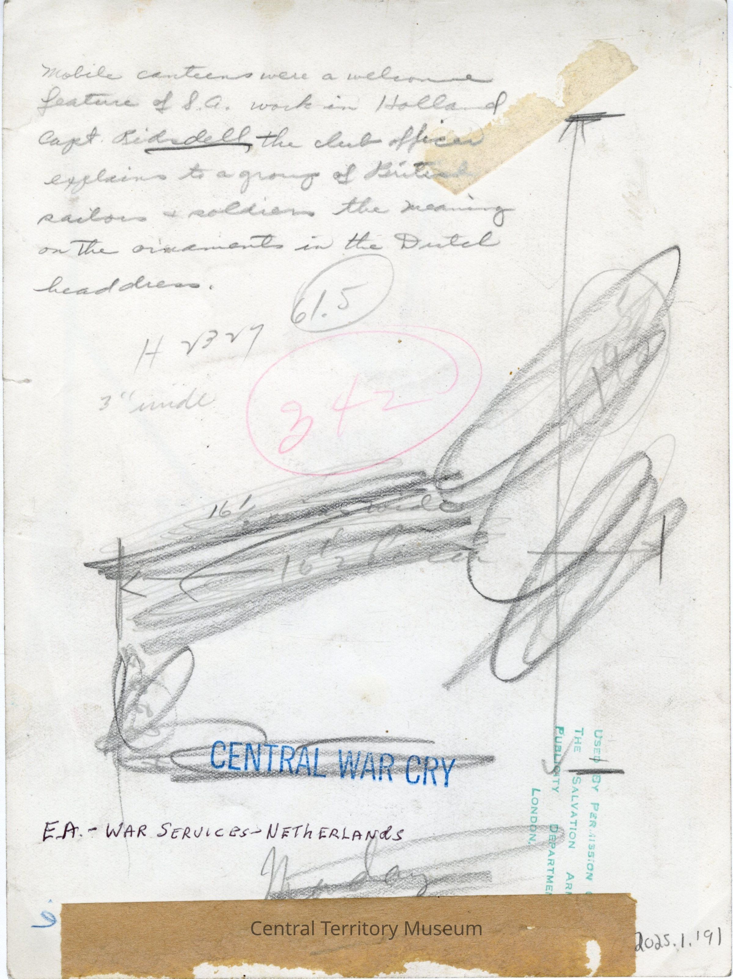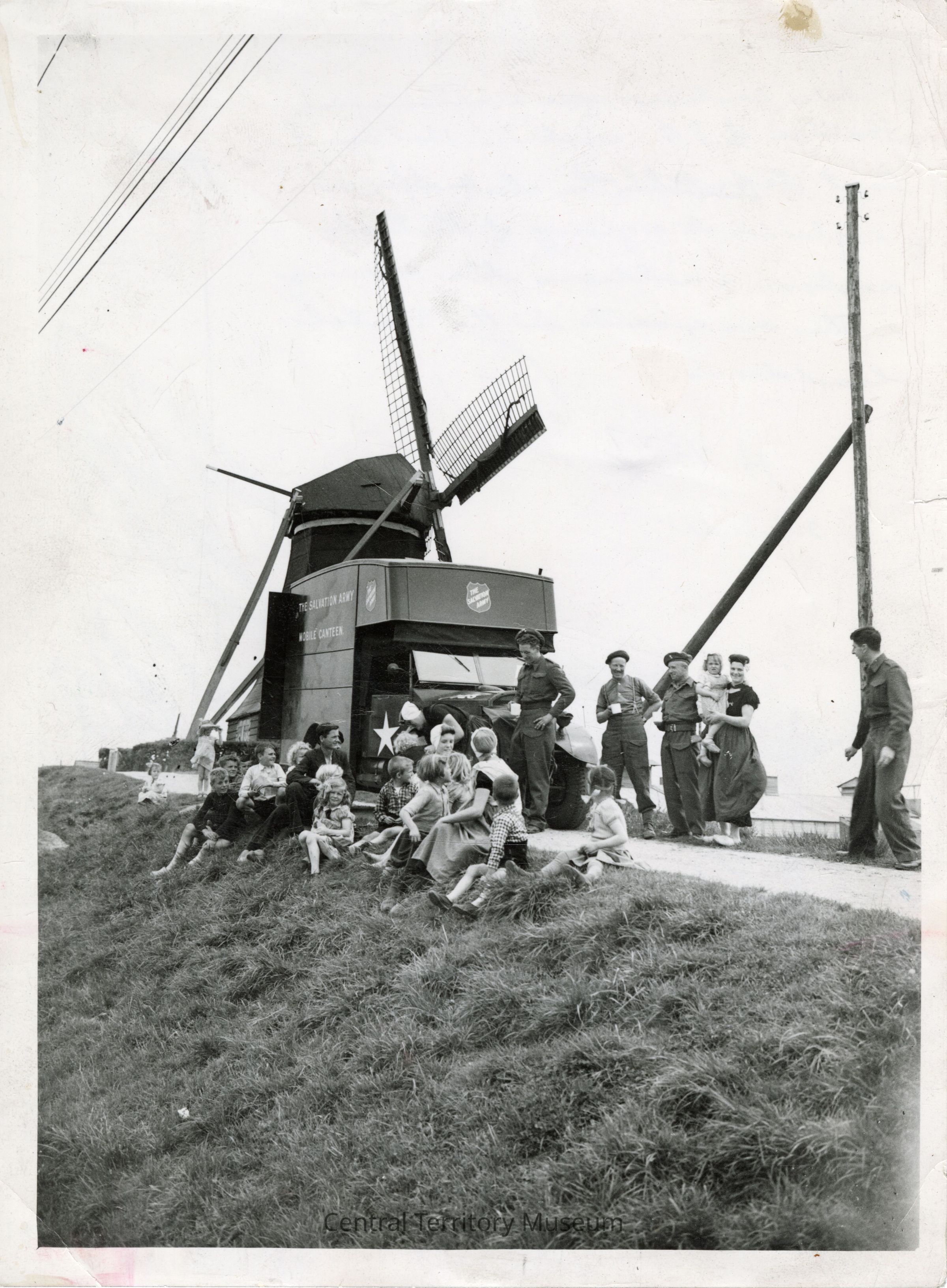 Photo of a group of men, women, and children gathered near a Salvation Army canteen somewhere in The Netherlands. A windmill can be seen behind the truck. Several of the men standing near the canteen are wearing military uniforms. Several of the women are wearing traditional Dutch clothing, including clogs.Acquisition