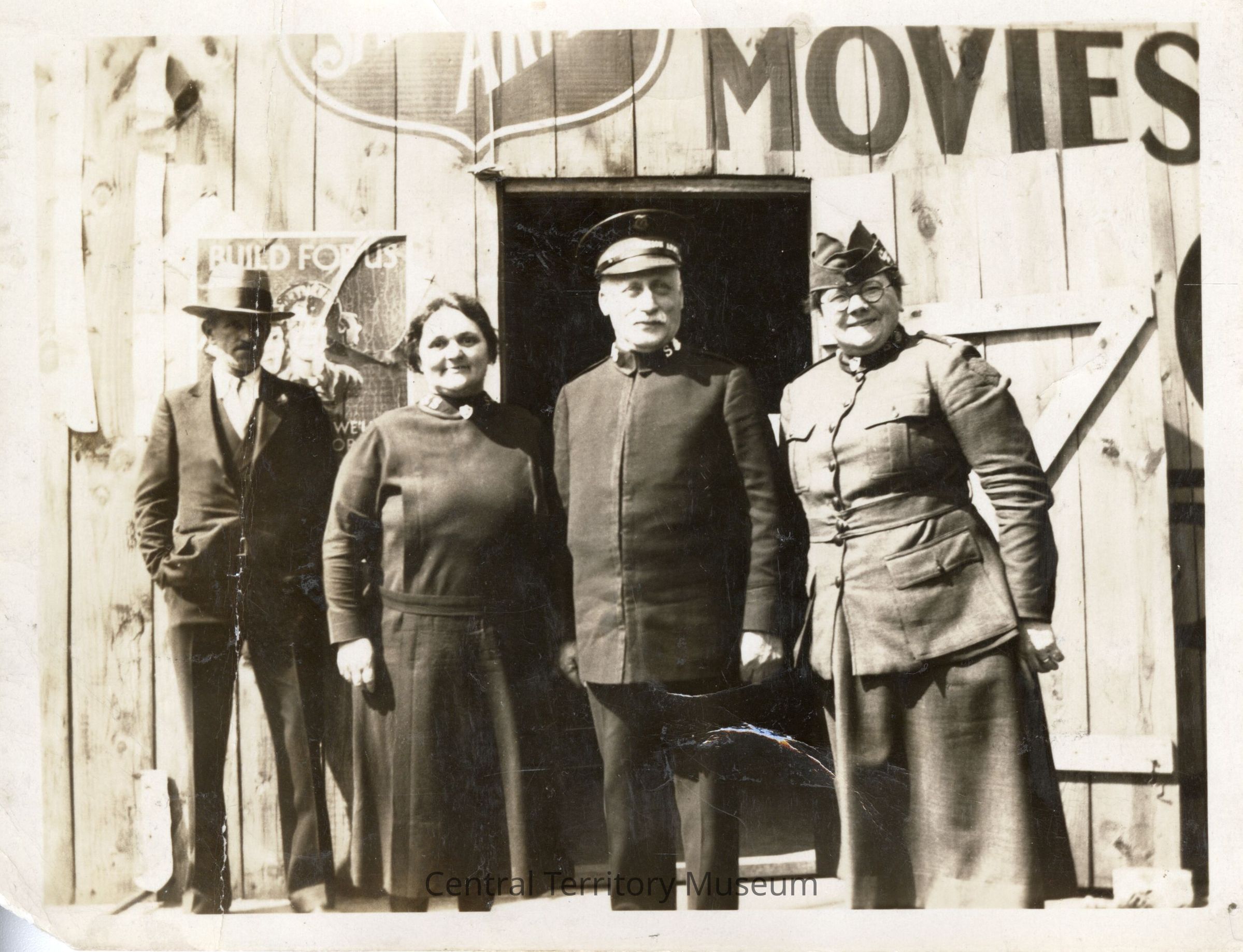 Photo of three Salvation Army officers standing outside of the replica World War I hut in Detroit, MI. A man stands just behind the group on the left. Mary "Ma" Casley Sheppard is on the right, wearing her Doughnut Girl uniform.