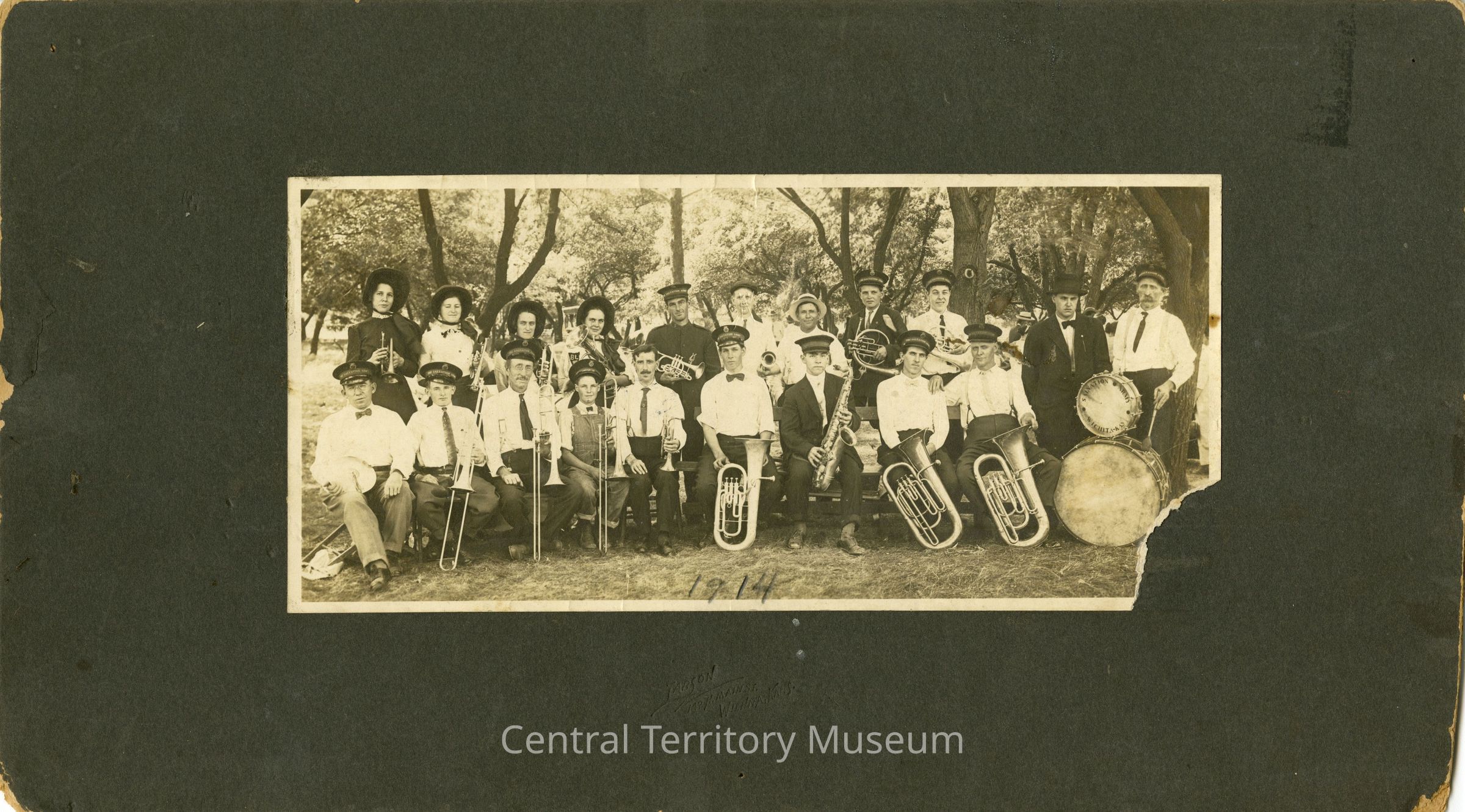 Photo of the Wichita (Citadel), KS corps band, taken outdoors. The men and women are arranged in two rows with each person holding an instrument. A grove of trees surrounds the musicians. Agnes Tolle Fleeman is standing in the second row, second from left. The bass drum, seen on the right, has a plain drumhead while the smaller drum resting on top has a drumhead printed "Salvation Army Wichita Kansas". The photo is mounted on a black cardboard mount and the year 1914 is penciled across the bottom.Acquisition