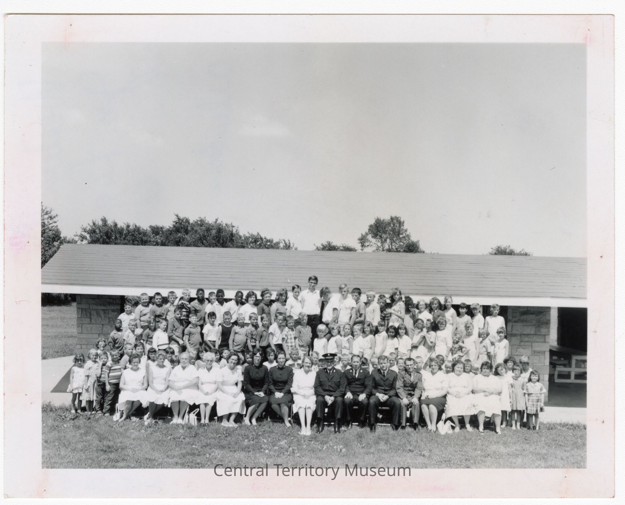 Photo of a group of children and adults posed outside in front the picnic shelter at Camp Gene Eppley. Red crop marks on face of picture wiped off as much as possible.