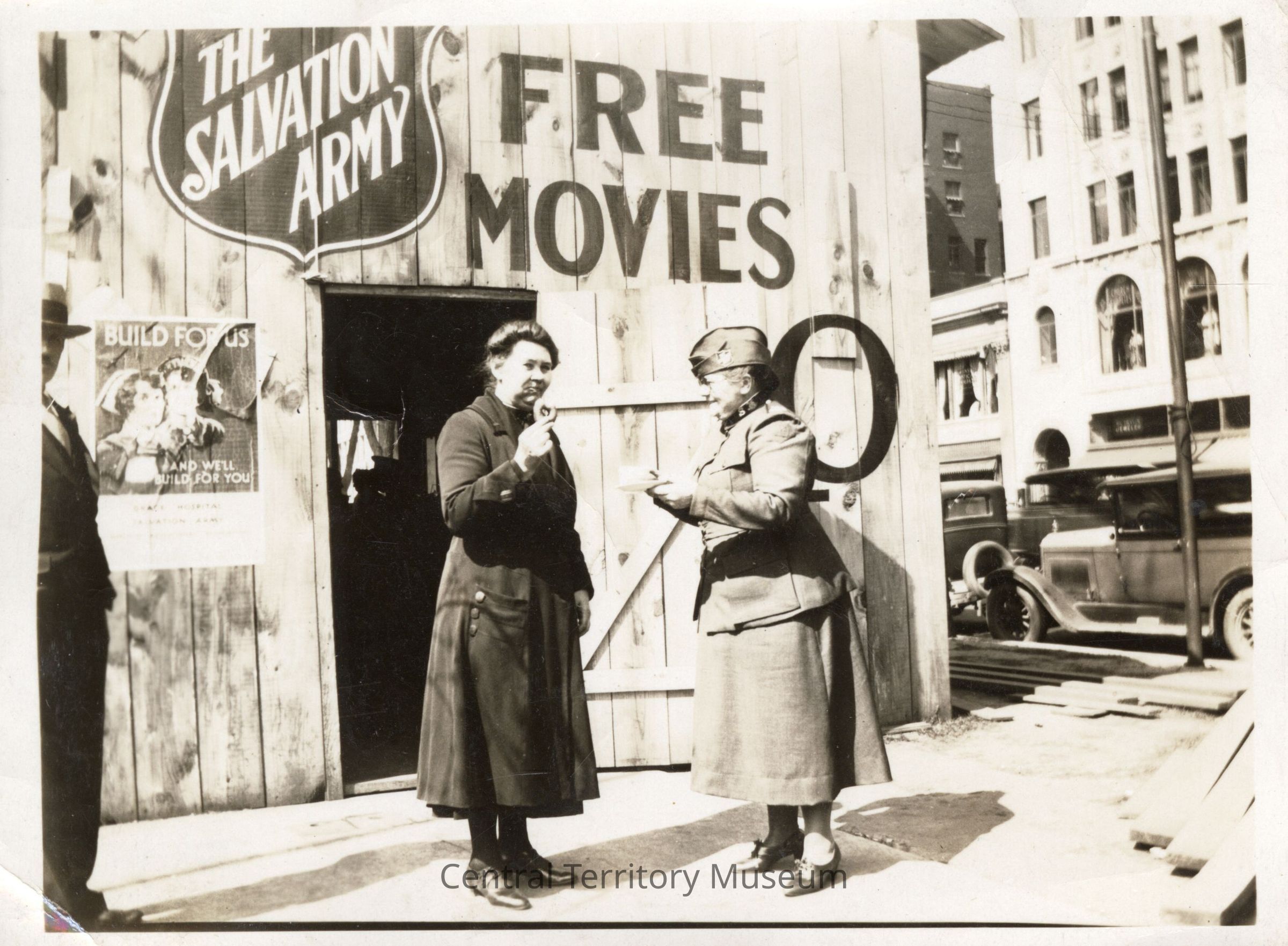 Photo of two women Salvationists standing outside of the doughnut hut built on Washington Boulevard at State Street in Detroit. The woman on the left is holding a doughnut and is wearing a dark coat. The woman on the right, possibly Mary "Ma" Sheppard, is wearing her Doughnut Girl uniform and is holding a cup and saucer. A man is partially seen on the left. The hut has a large Salvation Army Red Shield painted on the side with the phrase "Free Movies" printed to its left (photo right). A poster near the entry has a nurse and a female Salvationist with the slogan "Build for us and we'll build for you".