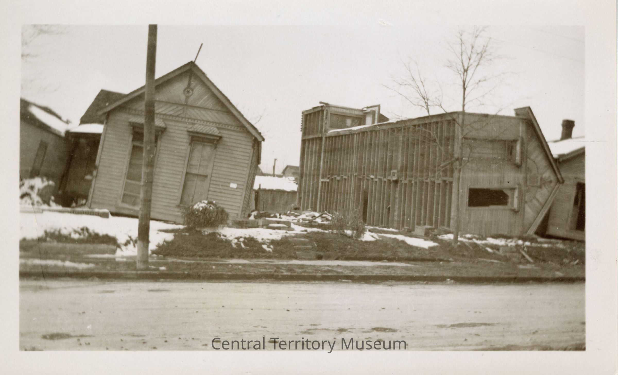 Photo taken after the March 1937 Ohio River floods receded in Southern Indiana. The image depicts three houses from the street. The house on the left is tilting toward the right, the house in the middle is lying on its side, and the third house, just barely seen on the right, is also tilted. The street looks muddy and snow is blanketing the ground and roofs.Acquisition