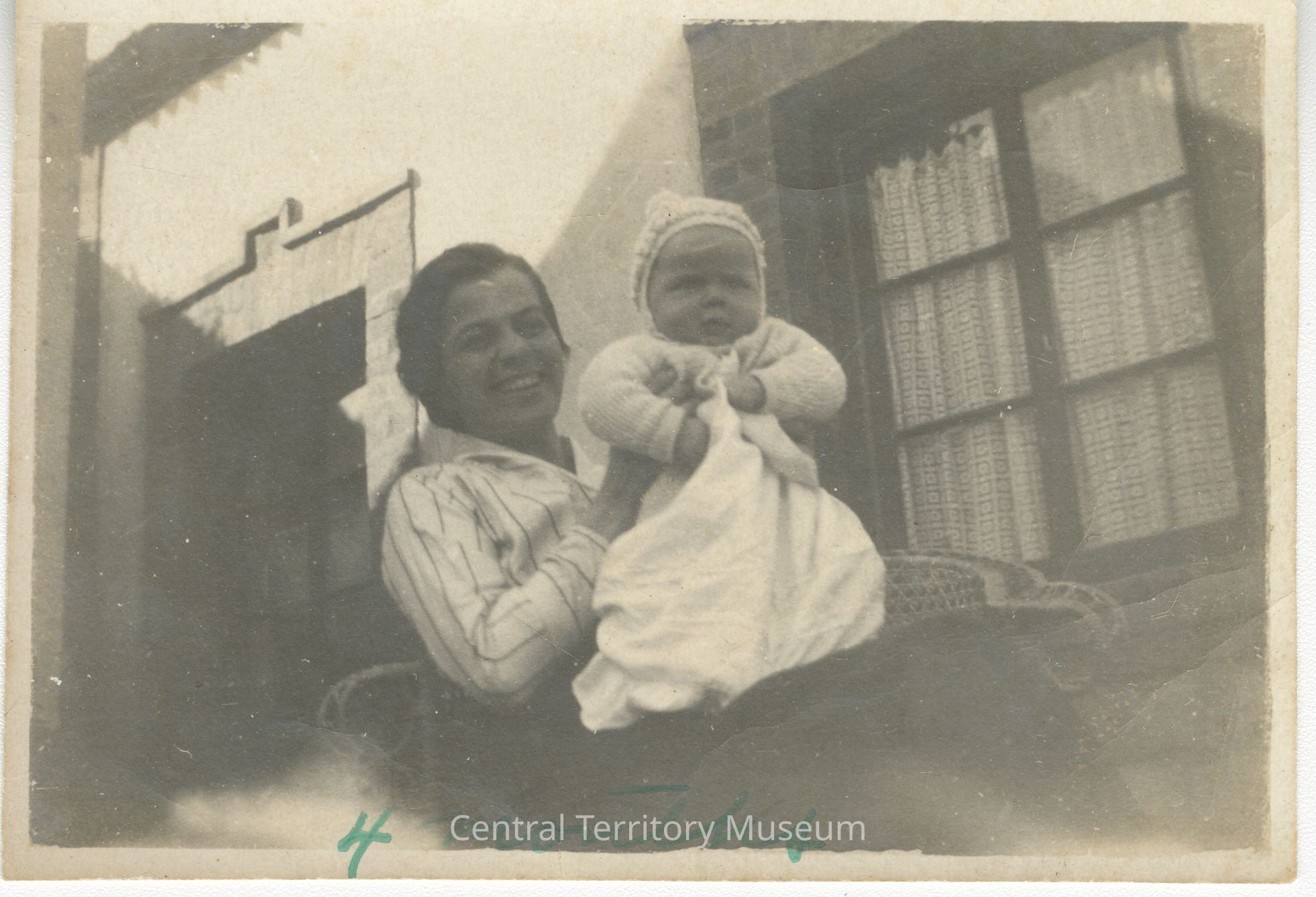Photo of Ellen Brandt, holding her son Charles. She is seated in a wicker chair, outside of a building, and is wearing a striped blouse and dark skirt. The baby is wearing a white gown and a white cap. The words 4 months are written in green ink on the lower edge.Acquisition